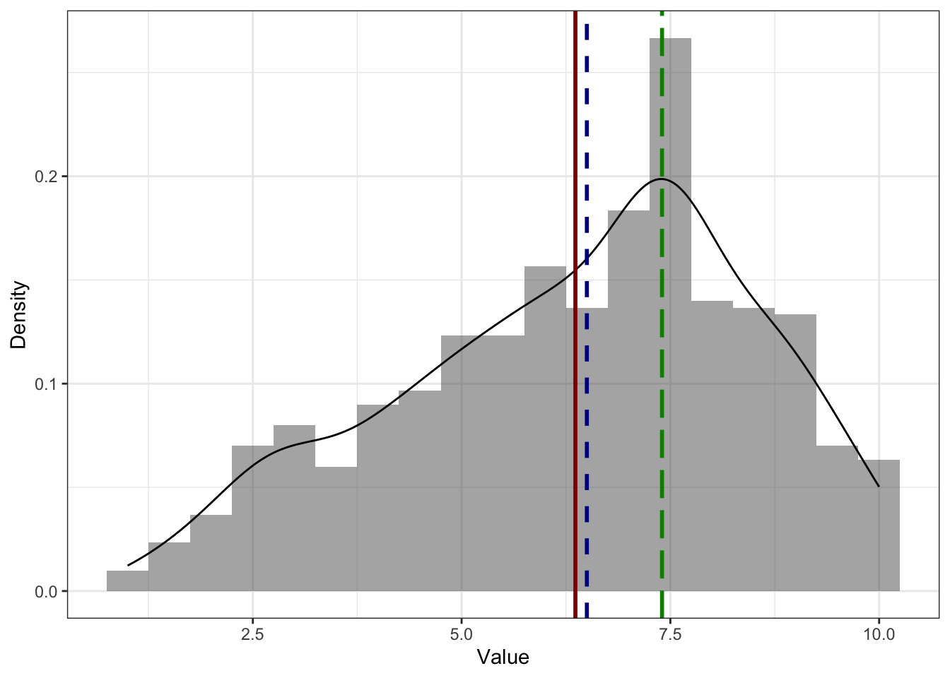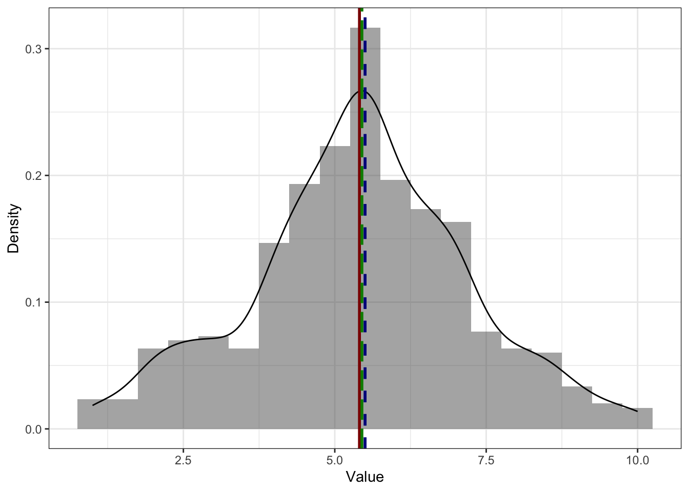 .Практически, потому что мода для непрерывной переменной определена по функции плотности вероятности [черная линия на графике], которая не всегда точно аппроксимирует (в данном случае то же, что и сглаживает) эмпирическое распределение. На картинке ниже мы видим, что по гистограмме мода должна была бы быть в районе самого высокго столбика, однако при сглаживании гистограммы пик немного съехал, и мода оказалась в вершине графика функции плотности вероятности.