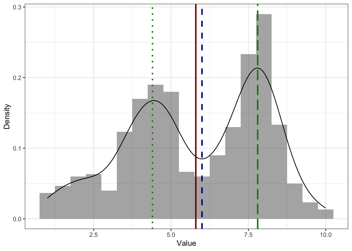 Со средним и медианой в случае бимодального распределения происходит примерно то же, что и в случае асимметричного распределения — второй пик смещает к себе обе меры центральной тенденции, причем среднее вновь сильнее, чем медиану.