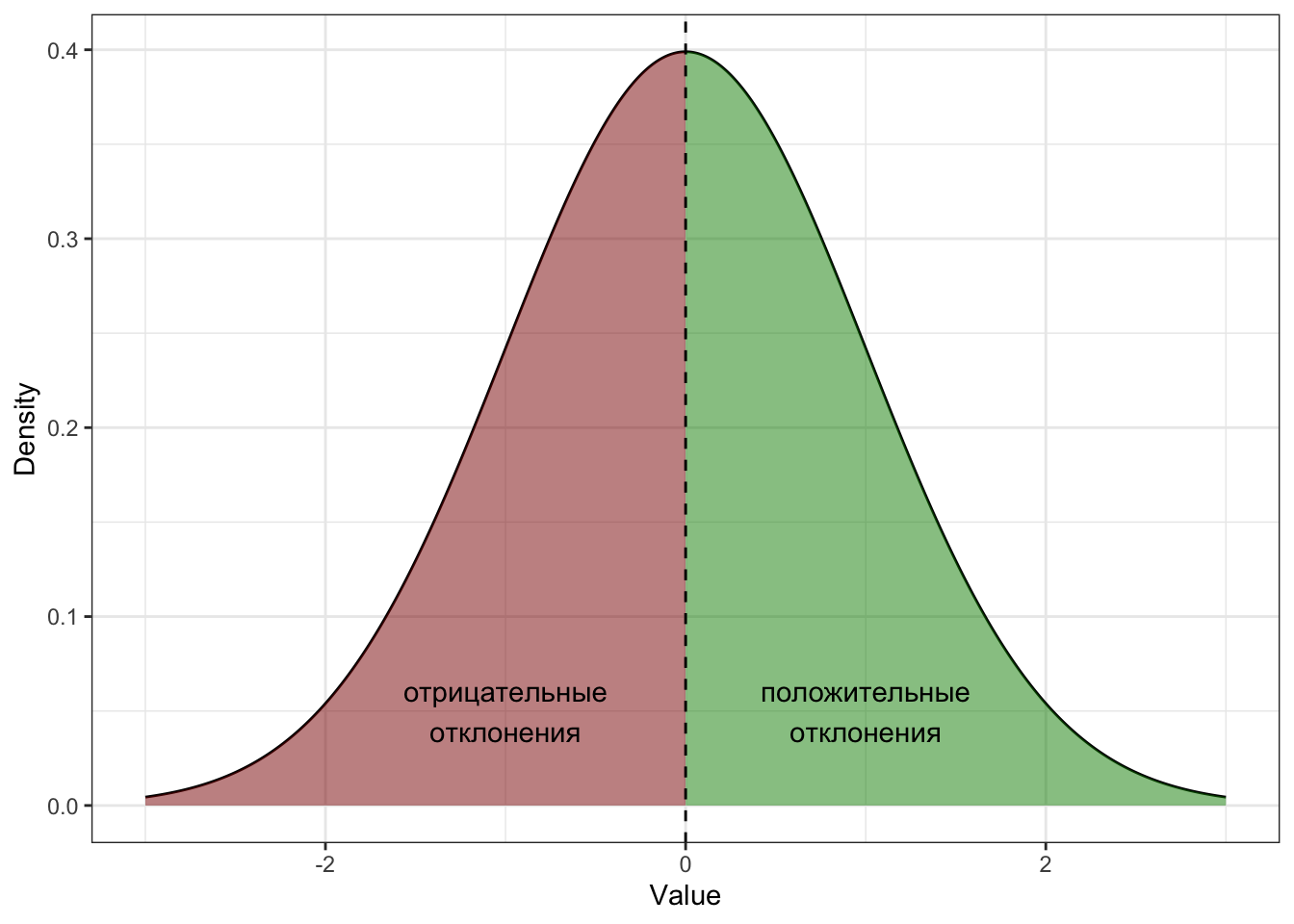 И, действительно, так как среднее находится в центре распределения, то часть значений лежит справа, а часть слева. Значит, будут как положительные, так и отрицательные отклонения — и их сумма в итоге будет равна нулю.