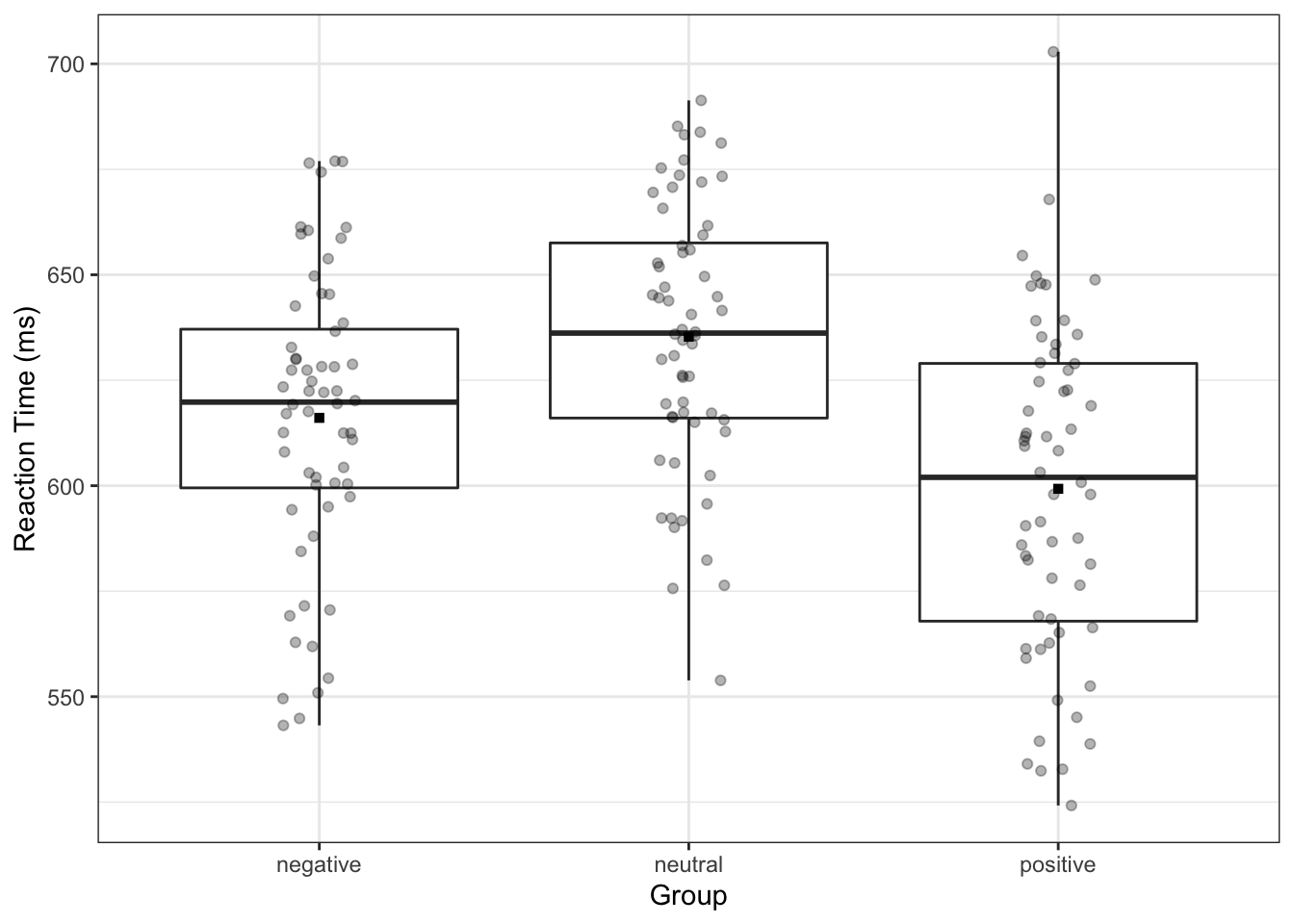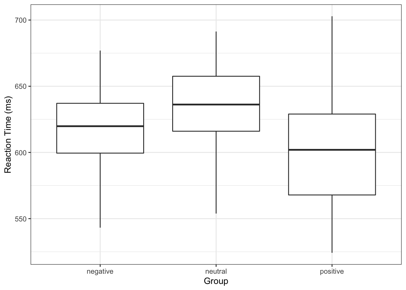 Одна категориальная и одна количественная переменная — это типичнейшая ситуация для эксперимента. Допустим мы изучаем эмоциональные штуки. Нам интересно сравнить скорость распознавания нейтральных и эмоционально окрашенных слов. Мы решили предложить испытуемому задачу лексического решения — предъявляем ему слова и не-слова. Испытуемому необходимо ответить, является ли представленный набор символов словом. Пусть ответ даётся нажатием на клавишу «→», если набор символов является словом, и «←», если таковым не является.