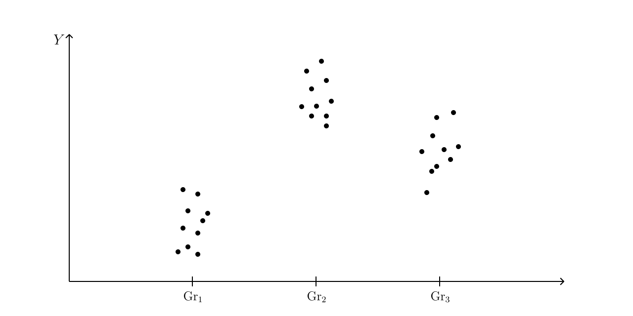 По оси \(x\) наша независимая экспериментальная переменная — категориальная, как можно наблюдать. Видно, что у нас три экспериментальные группы. По оси \(y\) наша зависимая экспериментальная переменная — количественная, как можно наблюдать. Видно, что в каждой группе наблюдений есть какой-то разброс.