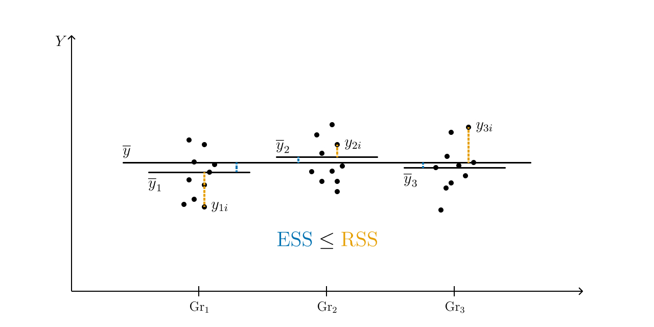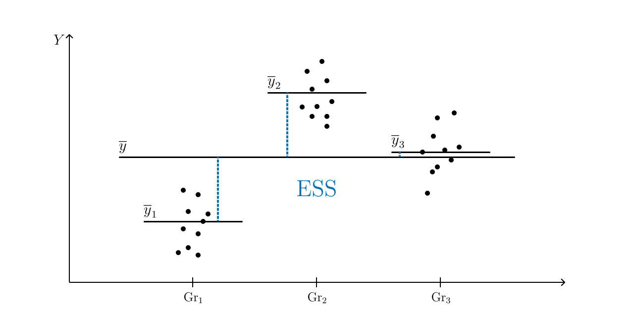 \[ \text{ESS} = \sum_{j=1}^p n_j \cdot (\overline y - \overline y_j)^2, \quad \text{df}_\text{ESS} = p-1 \]