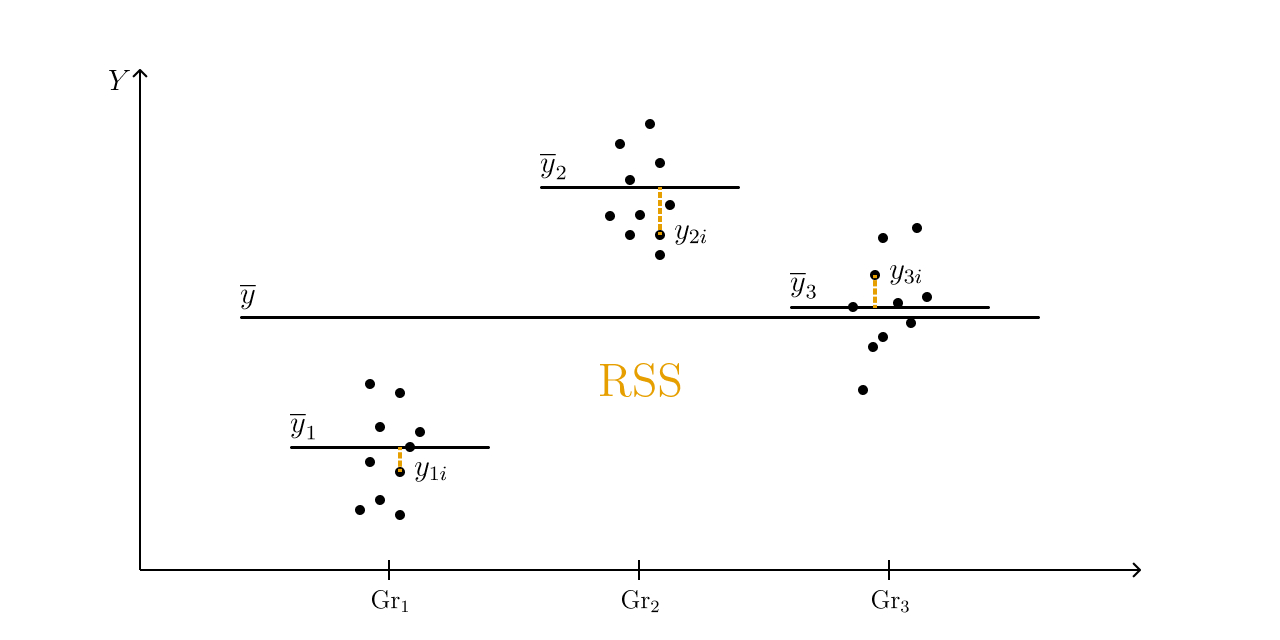 \[ \text{RSS} = \sum_{j=1}^p \sum_{i=1}^{n_j} (\overline y_j - y_{ji})^2, \quad \text{df}_\text{RSS} = n-p \]