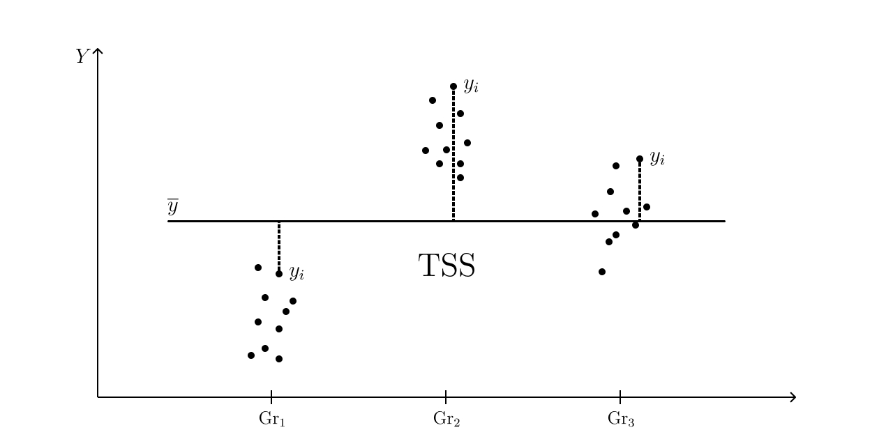 Прежде всего, есть общая изменчивость, или общая сумма квадратов (total sum of squares, TSS) которая складывается из [сумм квадратов] отклонений от общего среднего: