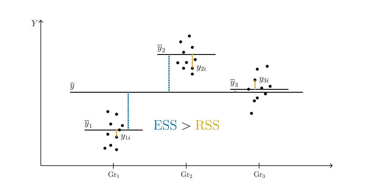 Есть факторная (объясненная) изменчивость (explained sum of squares, ESS) — это отклонения внутригрупповых средних от общего среднего с учетом количества наблюдений в каждой из групп: