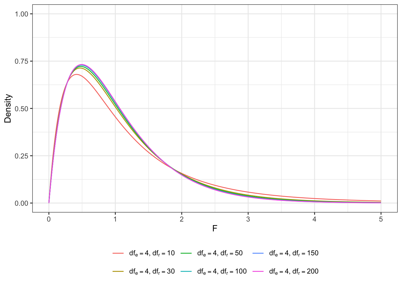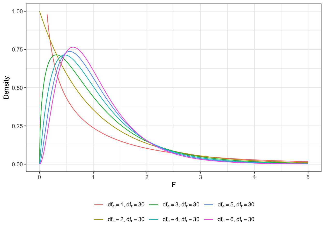 Значение F-статистики подчиняется F-распределению (распределению Фишера). Его форма зависит от двух значений степеней свободы — \(\text{df}_\text{ESS}\) (\({df}_\text{e}\)) и \(\text{df}_\text{RSS}\) (\(\text{df}_\text{r}\)).