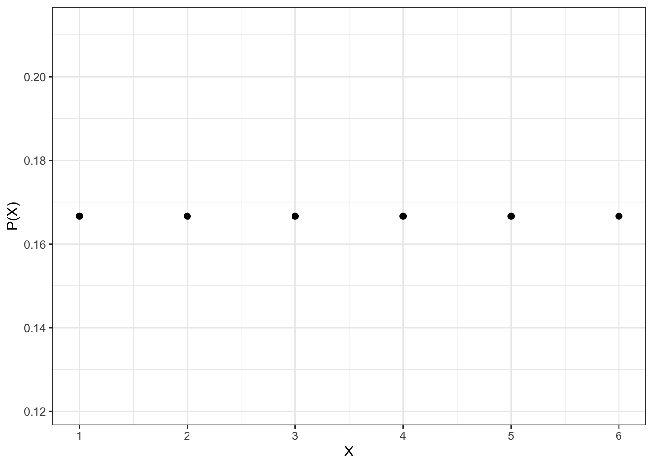 \[ \mathbb{P}(X=1) = \mathbb{P}(X=2) = \mathbb{P}(X=3) = \mathbb{P}(X=4) = \mathbb{P}(X=5) = \mathbb{P}(X=6 ) = \frac{1}{6} \approx 0.167 \]