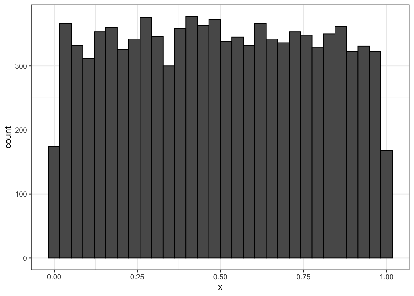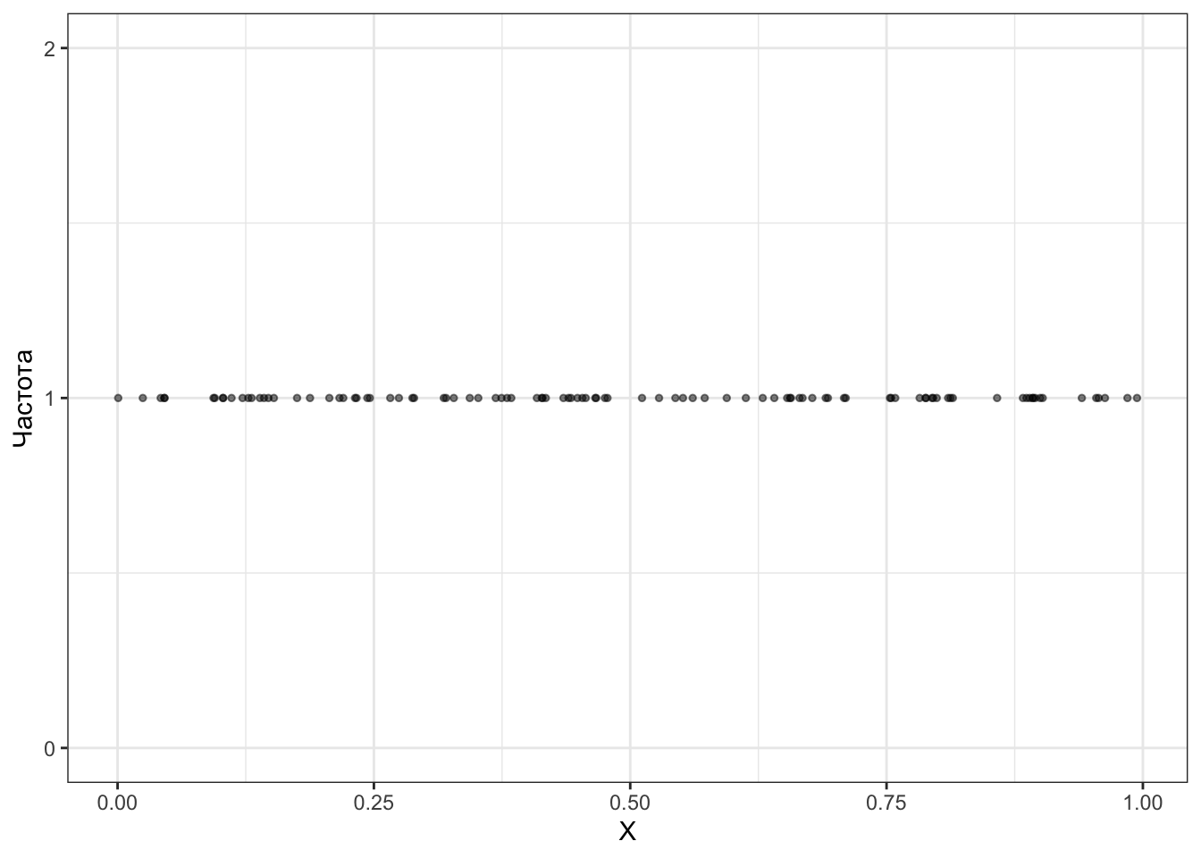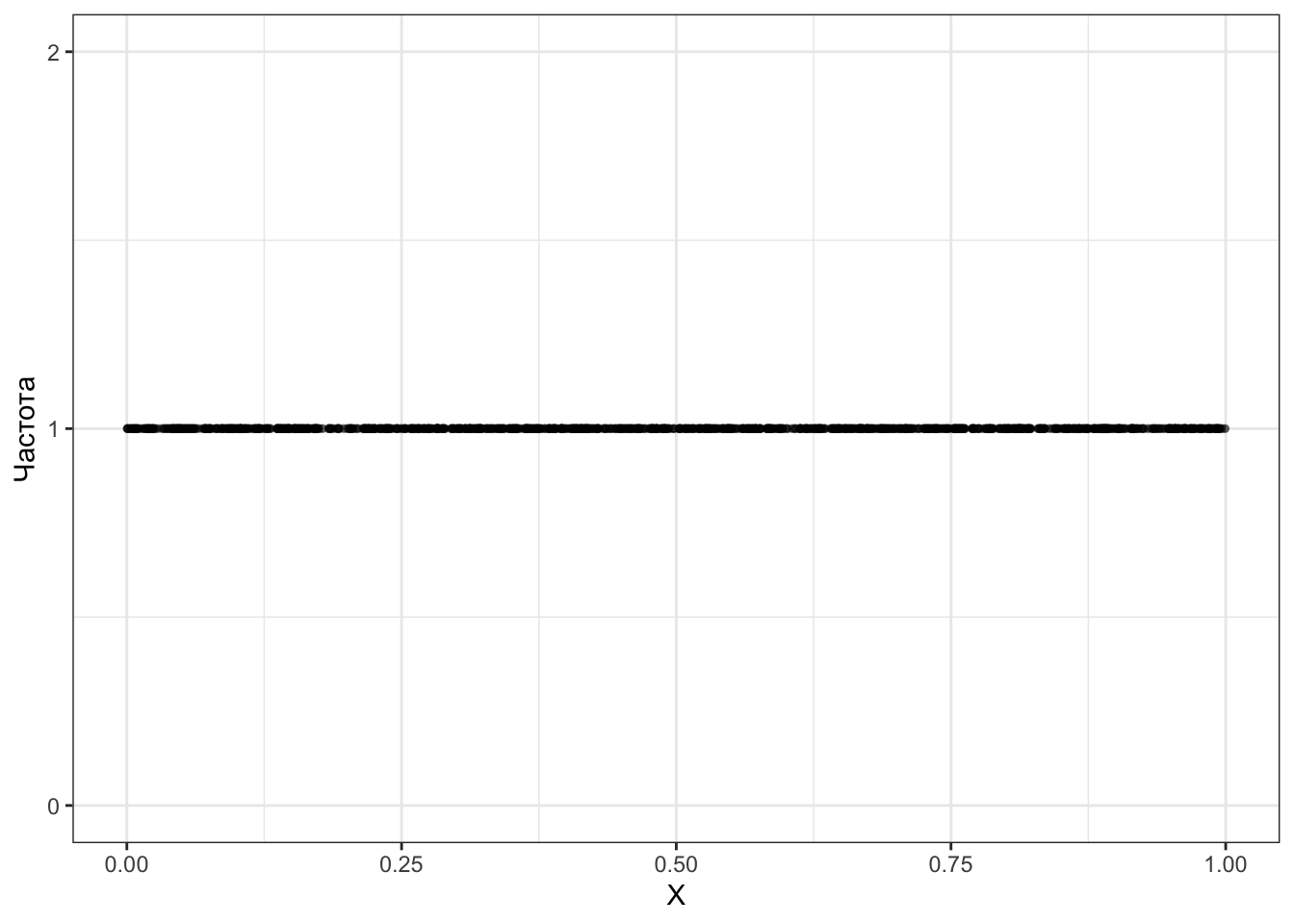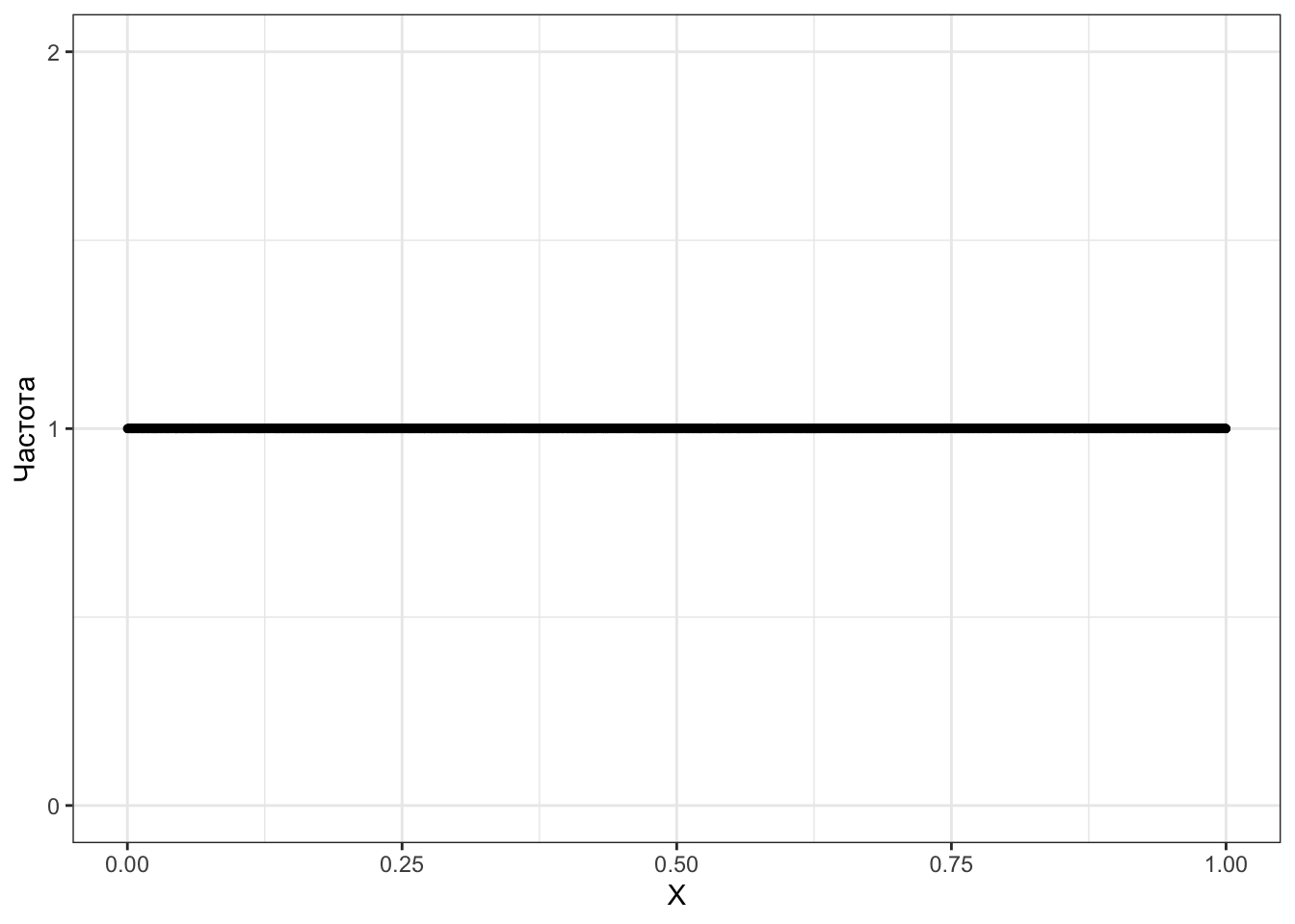 Визуально действительно выглядит так, что все числа из отрезка \([0, 1]\) выпадают равновероятно. Однако нечто, отображённое на оси \(y\) не может быть вероятностью, так как для все значений непрерывной случайной величины вероятность равна нулю.
