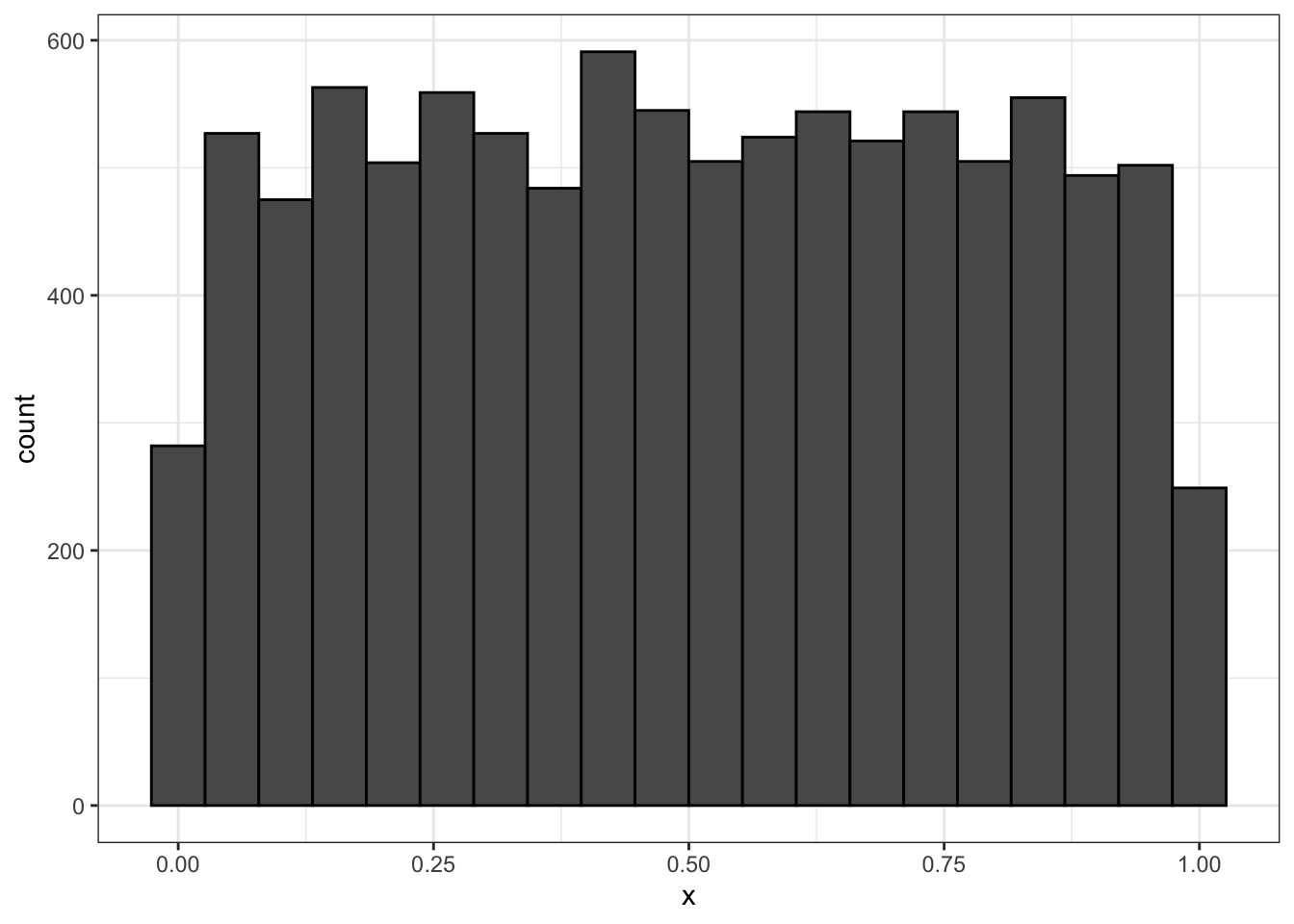 Пусть мы случайным образом выбираем 1000 чисел из отрезка \([0,1]\), считая что все числа могут попасться равновероятно. Займемся симуляцией и попробуем отобразить частоты, с которыми выпадают числа: