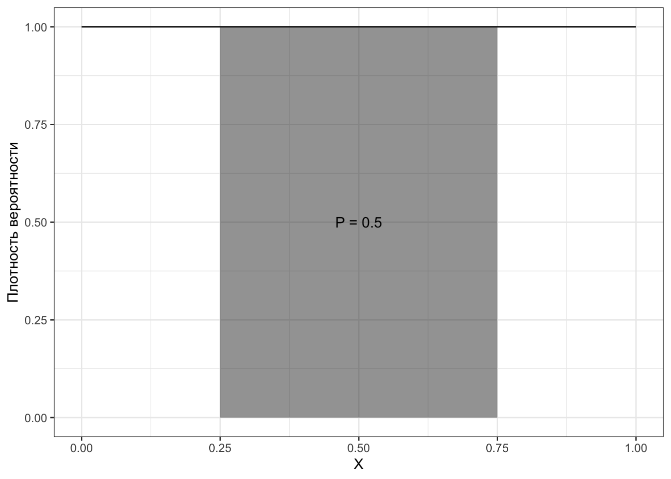 Посмотрим на примере равномерного распределения. Какова вероятность, что случайно выбранное из отрезка \([0,1]\) число попадёт в интервал \((0.25, 0.75)\)? Интуитивно кажется, что должно быть \(0.5\), так как длина этого интервала — полочина длины отрезка. Нарисуем.