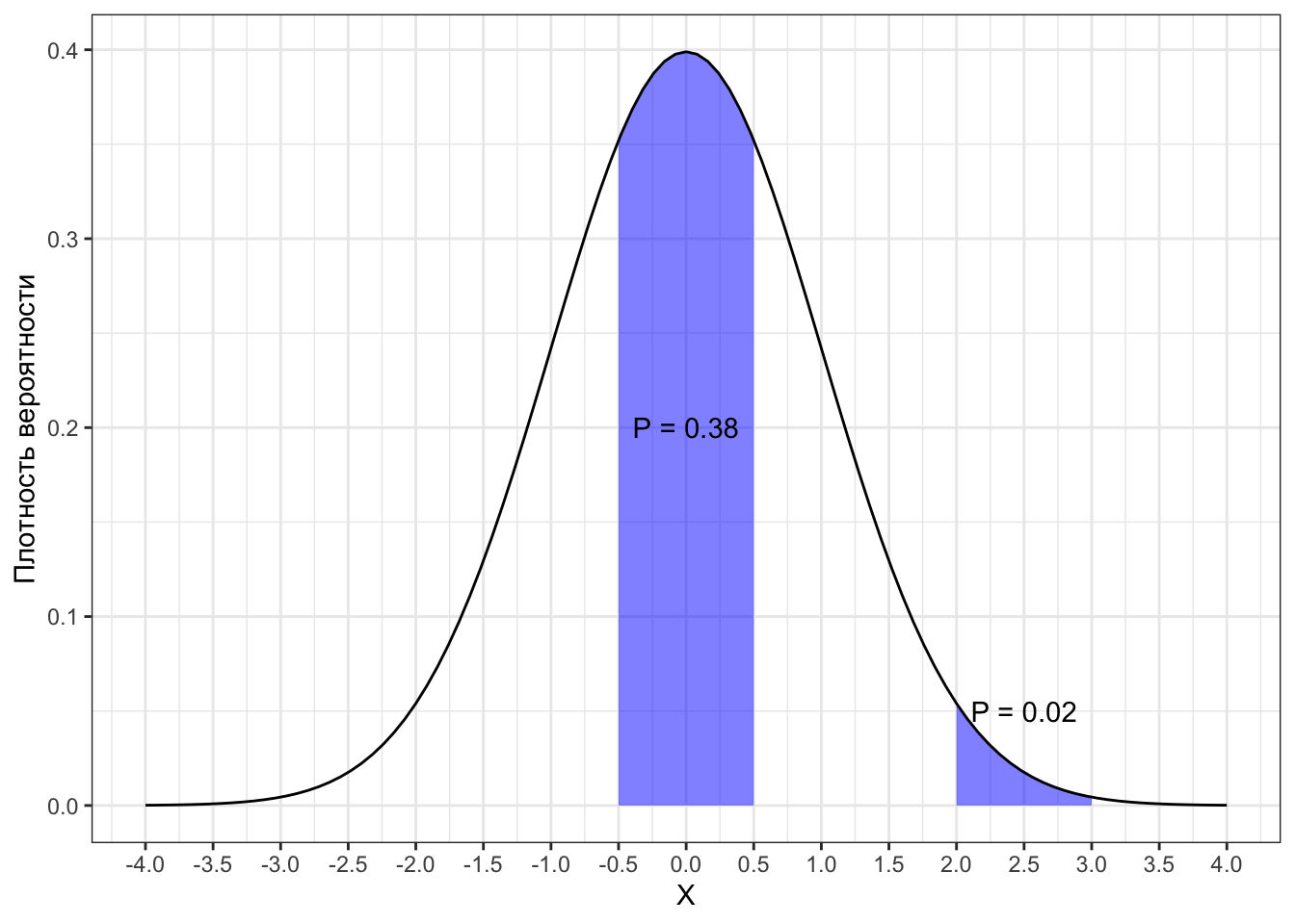 В данном случае был взят интервал шириной \(1\). Вероятность попадания значений случайной величины в диапазон \((-0.5, 0.5)\) относительно велика — \(0.38\), а для диапазона \((2, 3)\) — всего \(0.02\). Ровно это и отображает график плотности вероятности — значения в «середине» лежат плотнее, чем по краям.