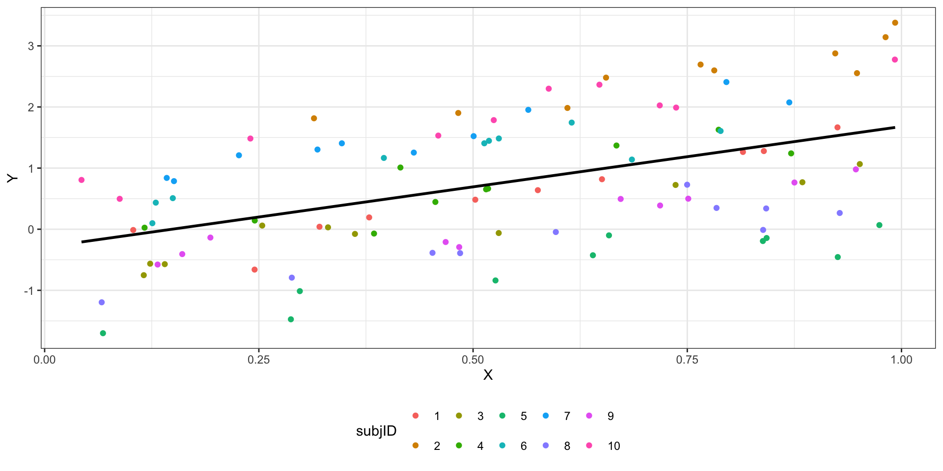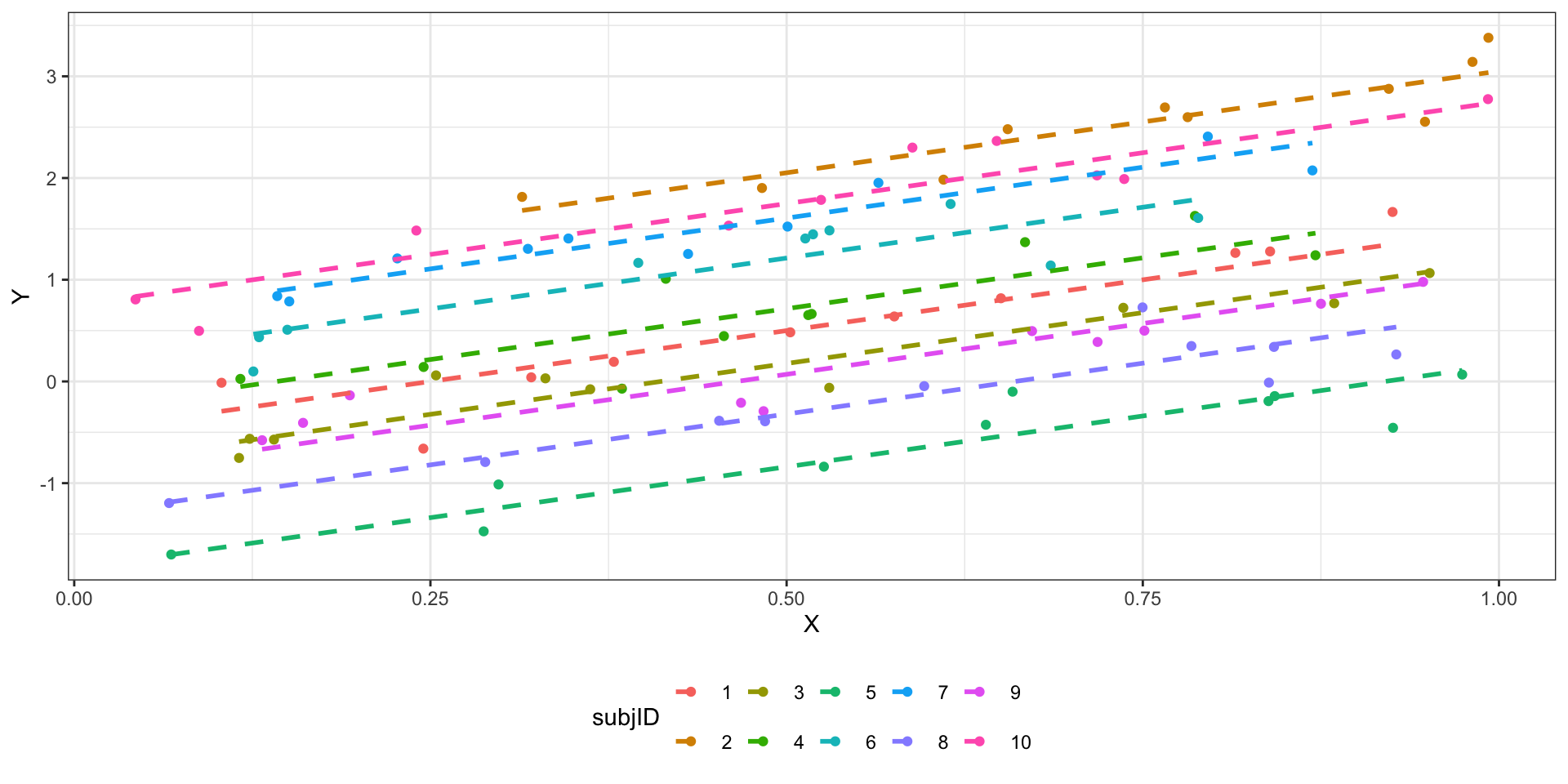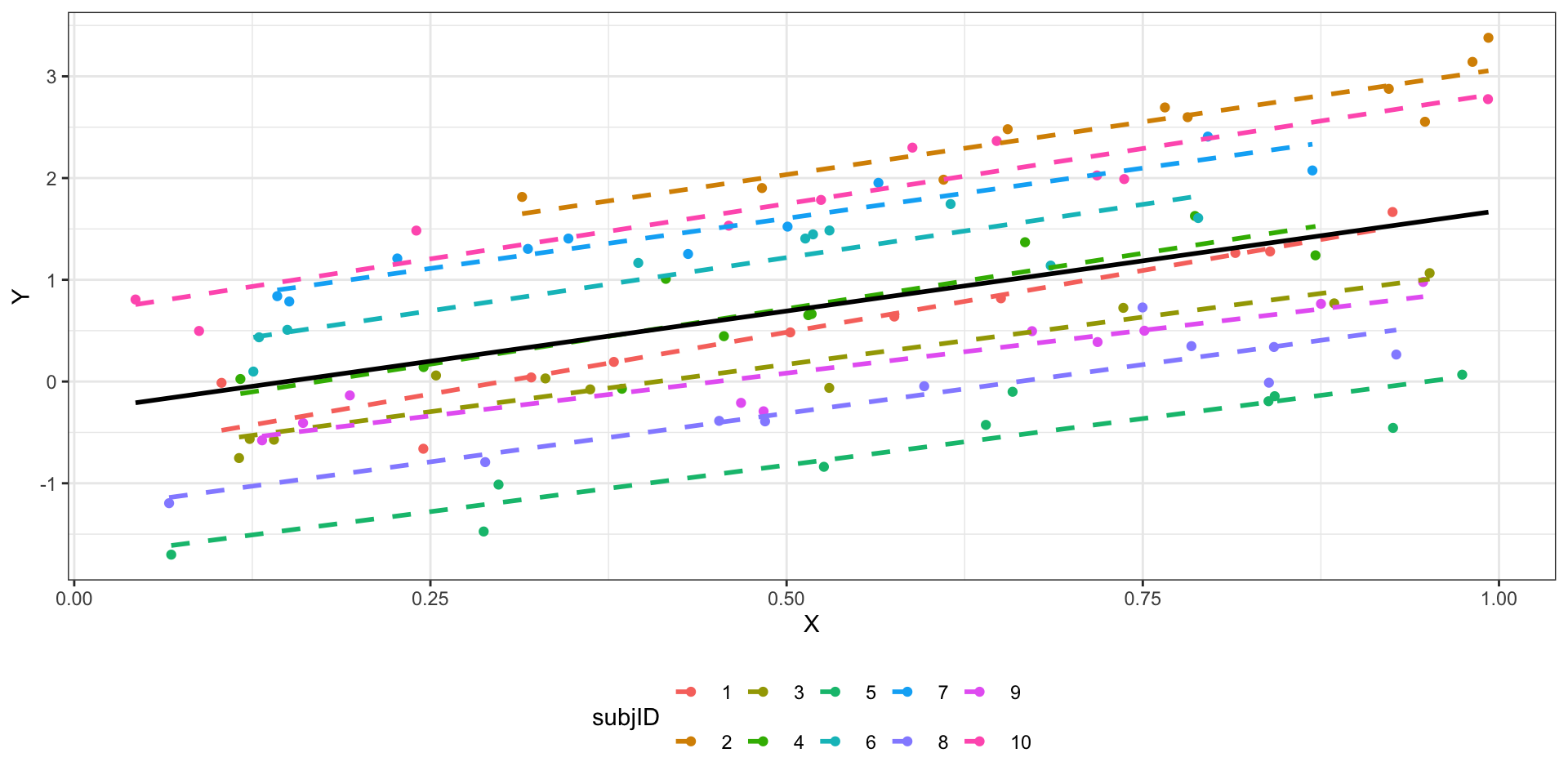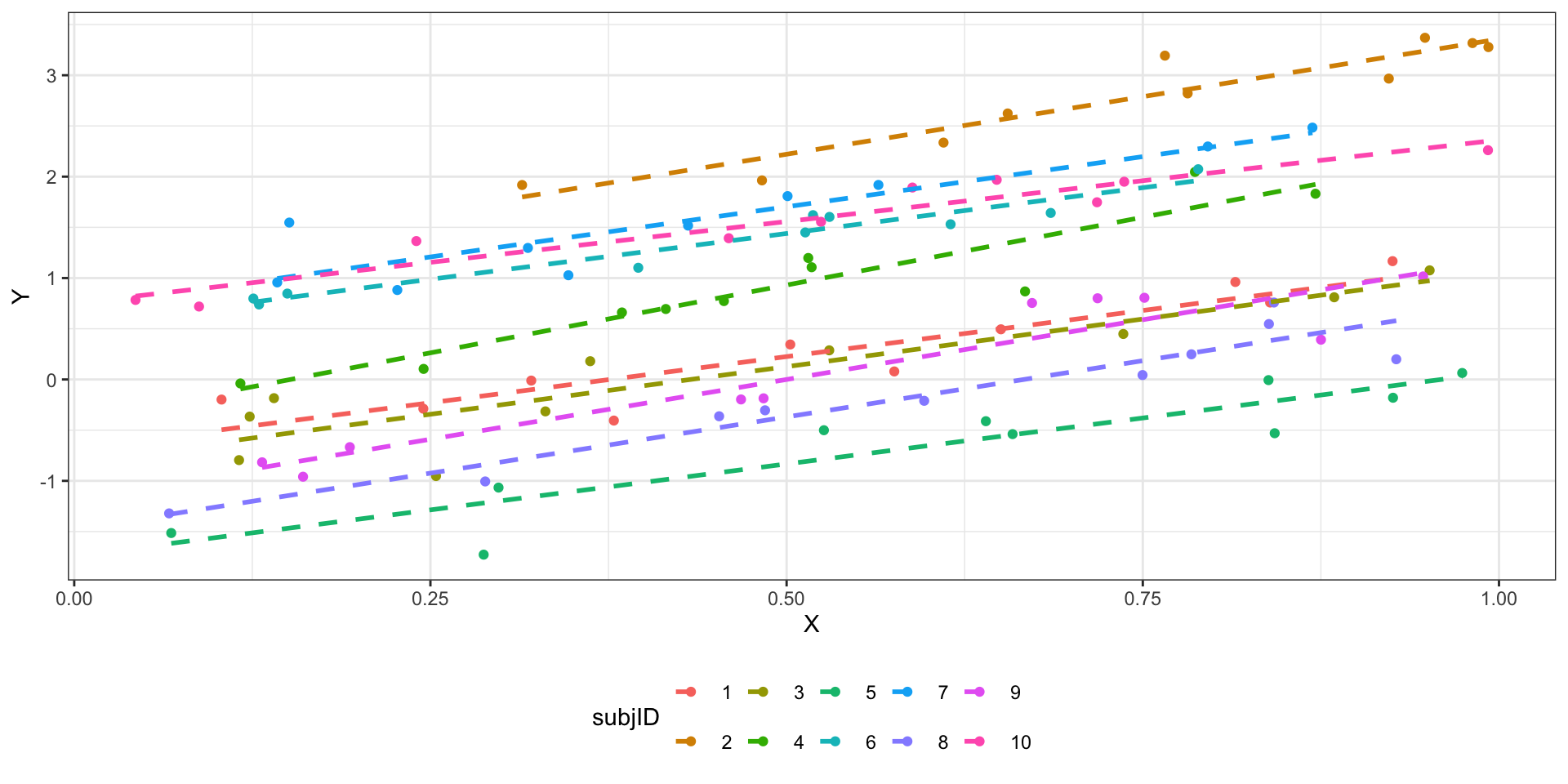 - Существует случайный интерсепт и случайный угловой коэффициент