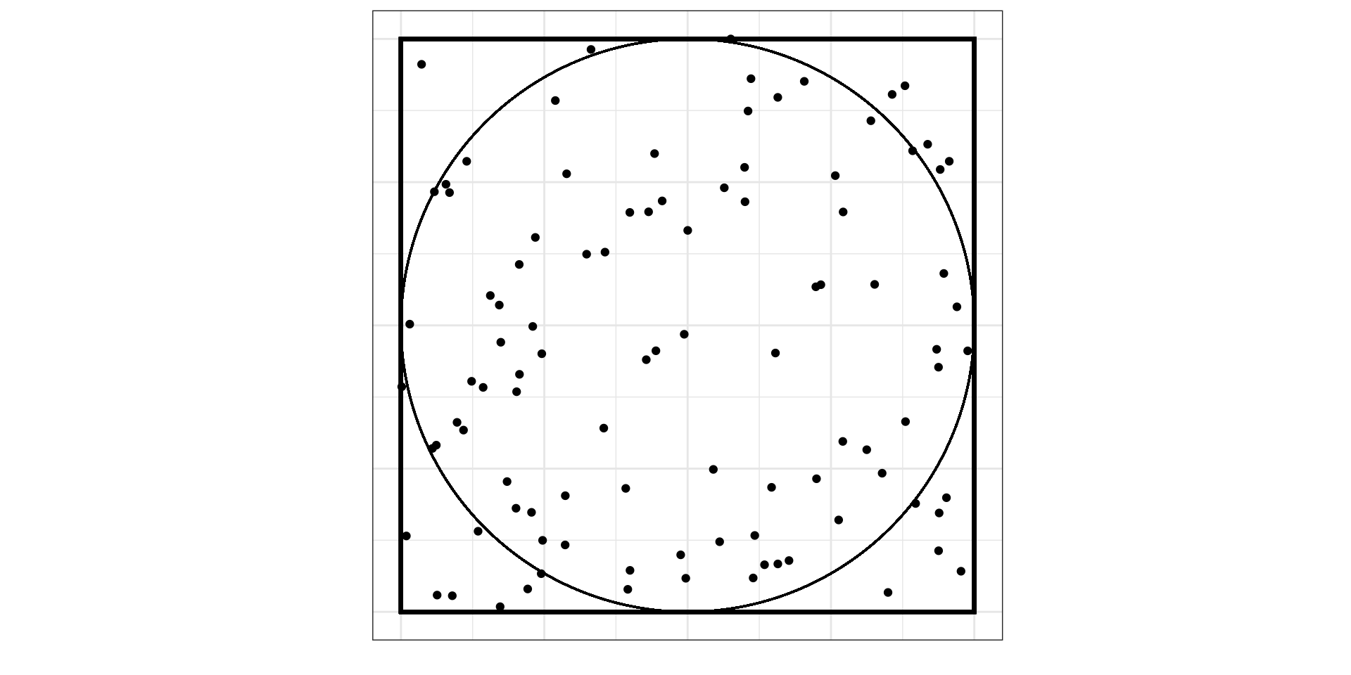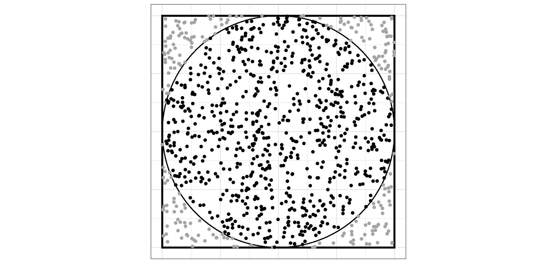 Вероятность попадания случайно прошенной точки в круг равняется отношению площади круга к площади квадрата, то есть: