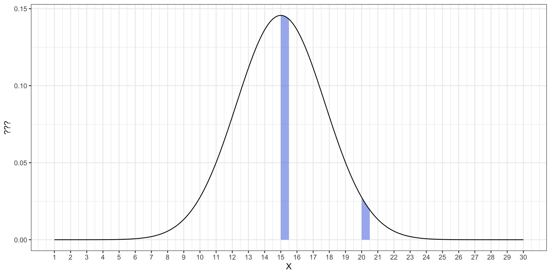 Формально плотность вероятности случайной величины \(\xi\) — это числовая фукнция \(f(x)\), отношение \(\dfrac{f(x_1)}{f(x_2)}\) значений которой в точках \(x_1\) и \(x_2\) задаёт отношение вероятностей попадания случайной величины \(\xi\) в интервалы \([x_1, x_1 + \Delta x]\) и \([x_2, x_2 + \Delta x]\) при \(\Delta x \rightarrow 0\).