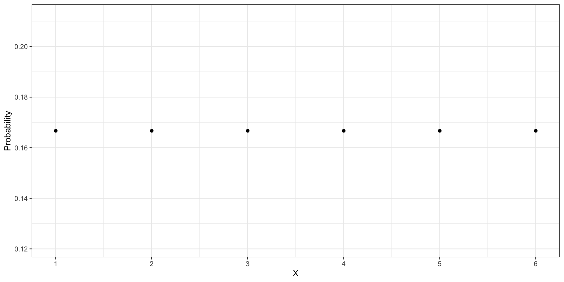 \[ \mathbb{P}(X = x) = \frac{1}{n} = \frac{1}{\infty} = 0 \]