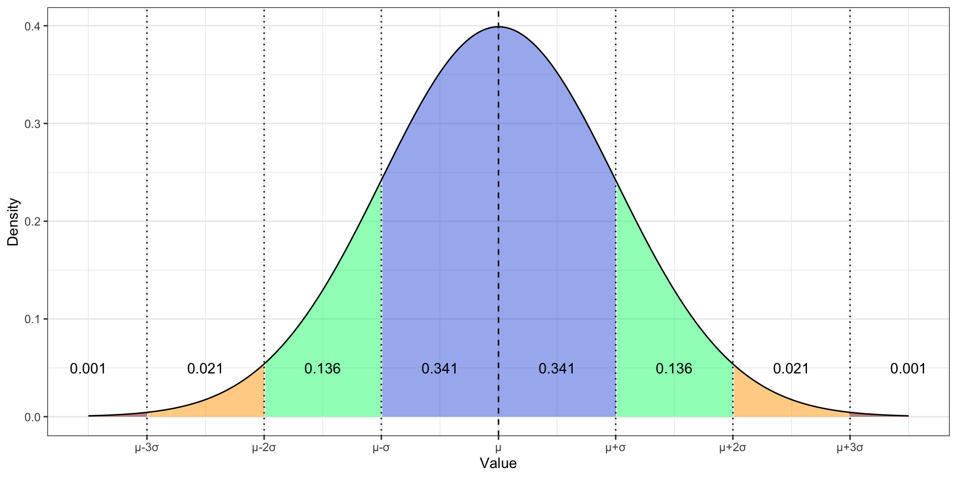 \[ f(x) = \frac{1}{\sigma \sqrt{2\pi}}e^{-\tfrac{(x - \mu)^2}{2\sigma^2}}, \]