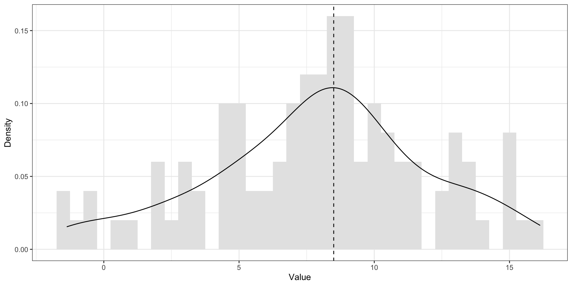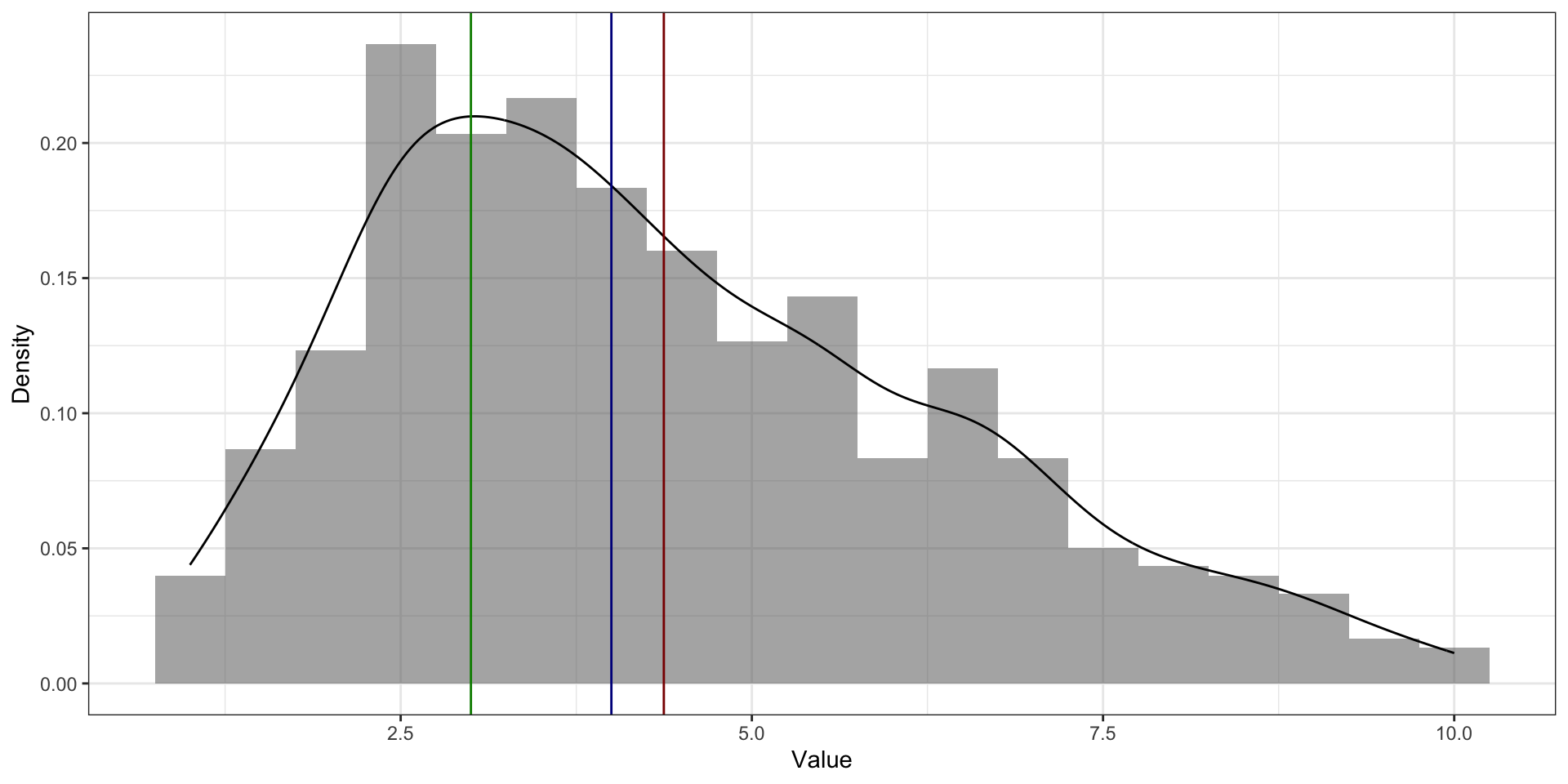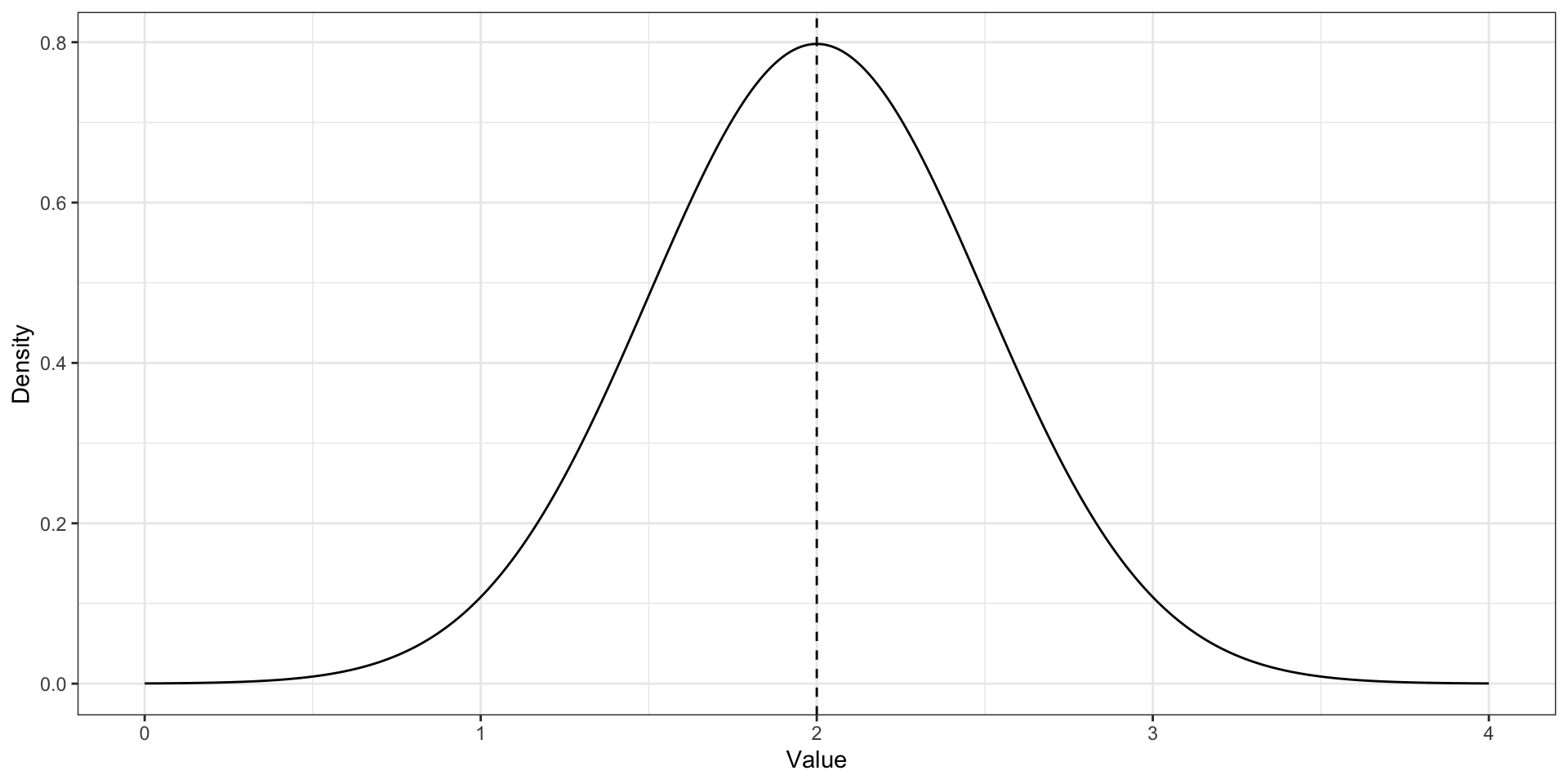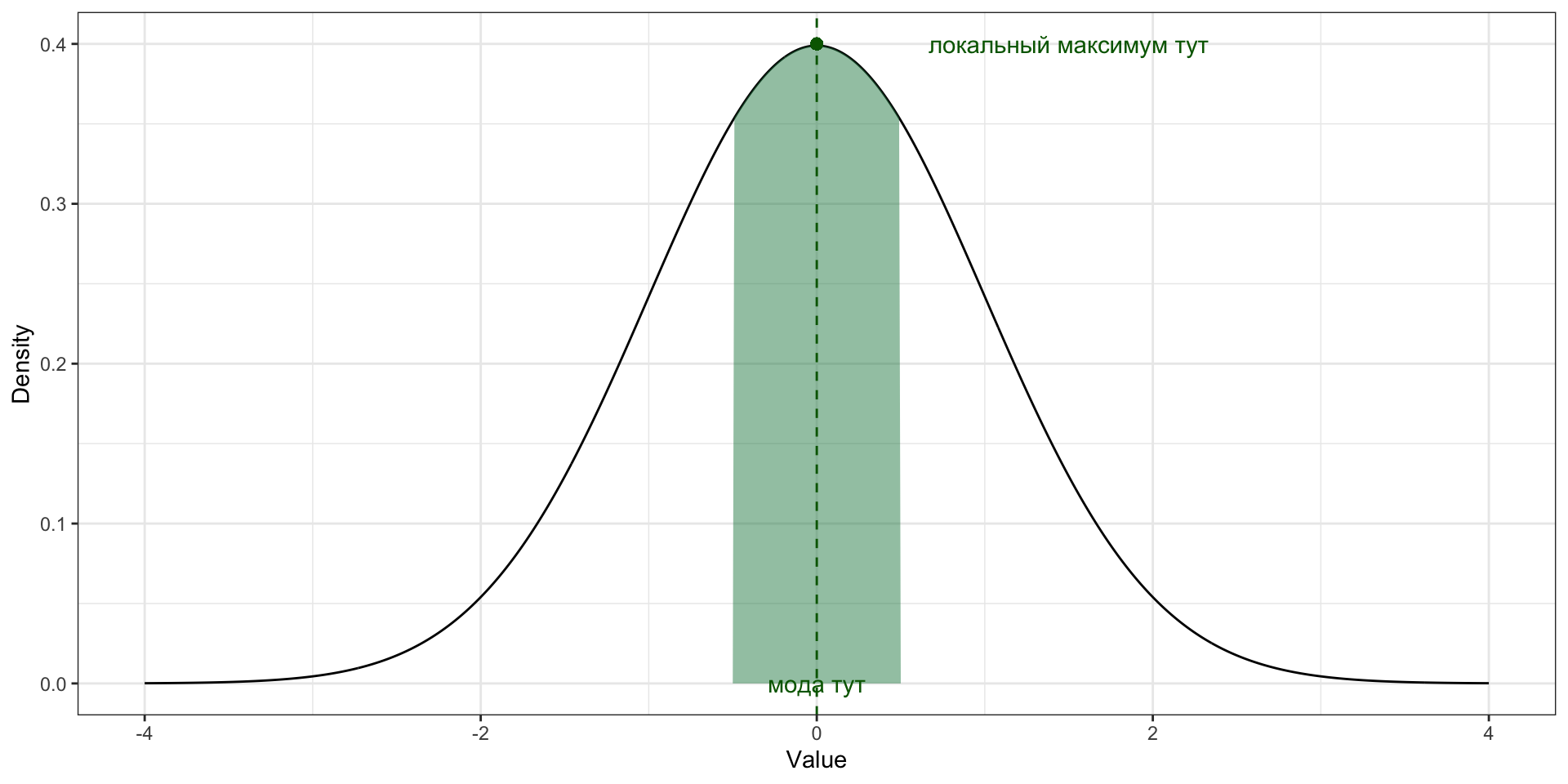 Мода [непрерывной переменной] — это значение переменной, при котором её функция плотности вероятности достигает локального[^local-max-mode] максимума.