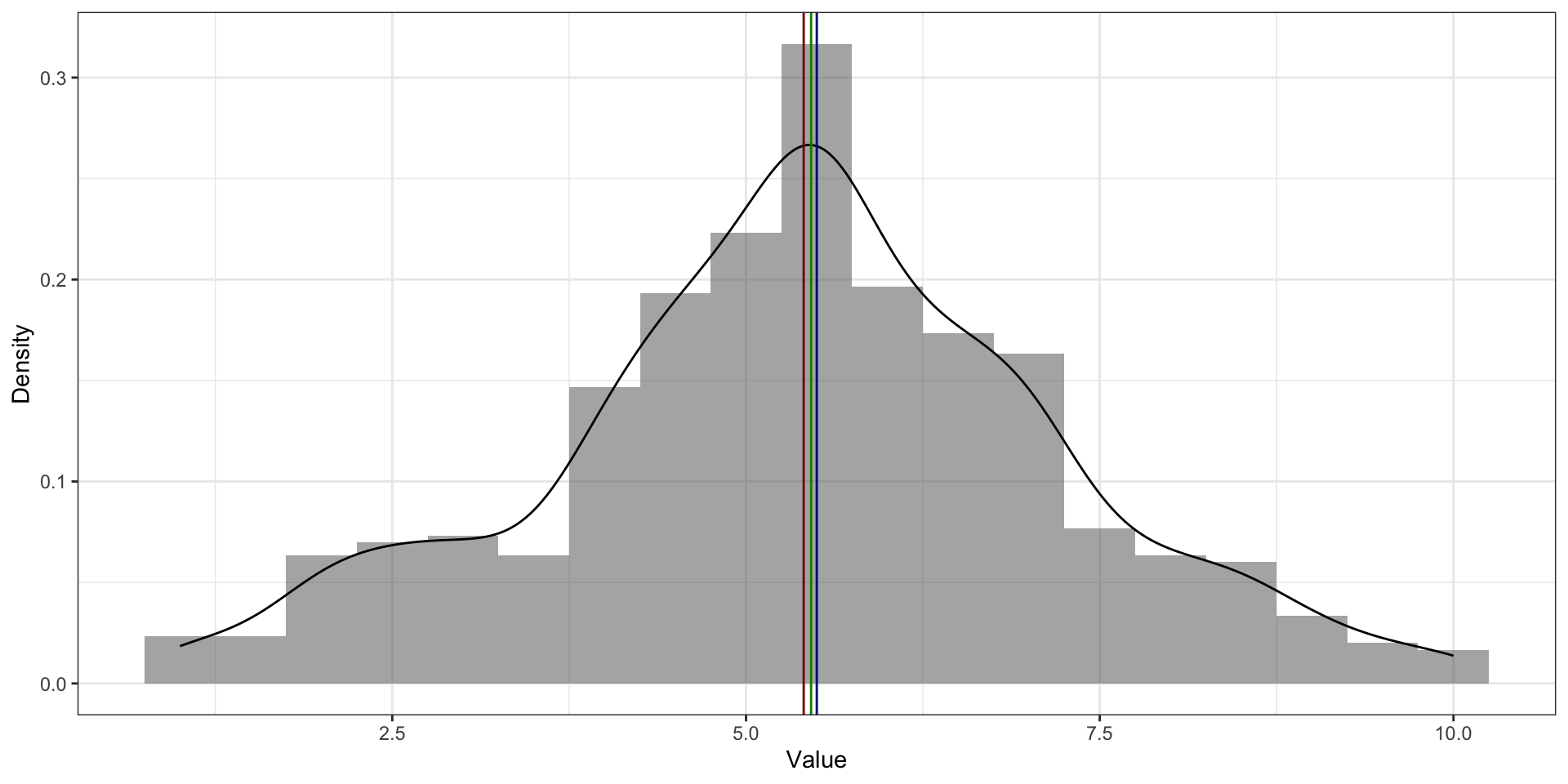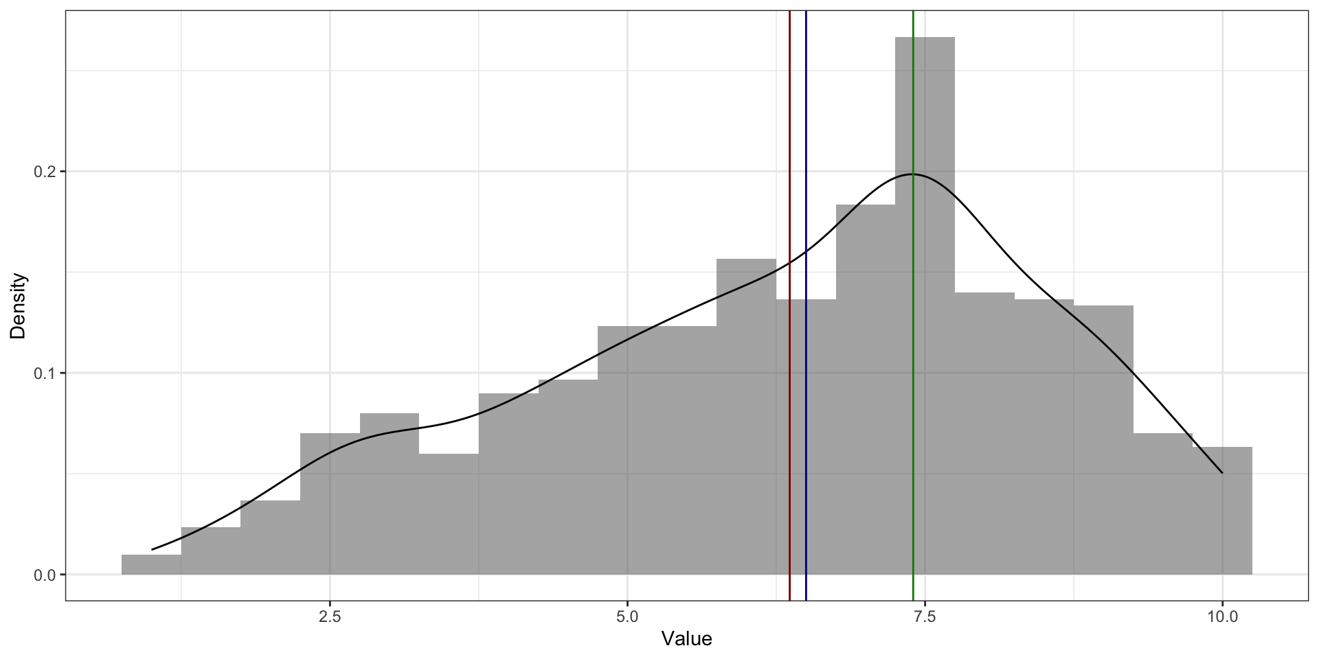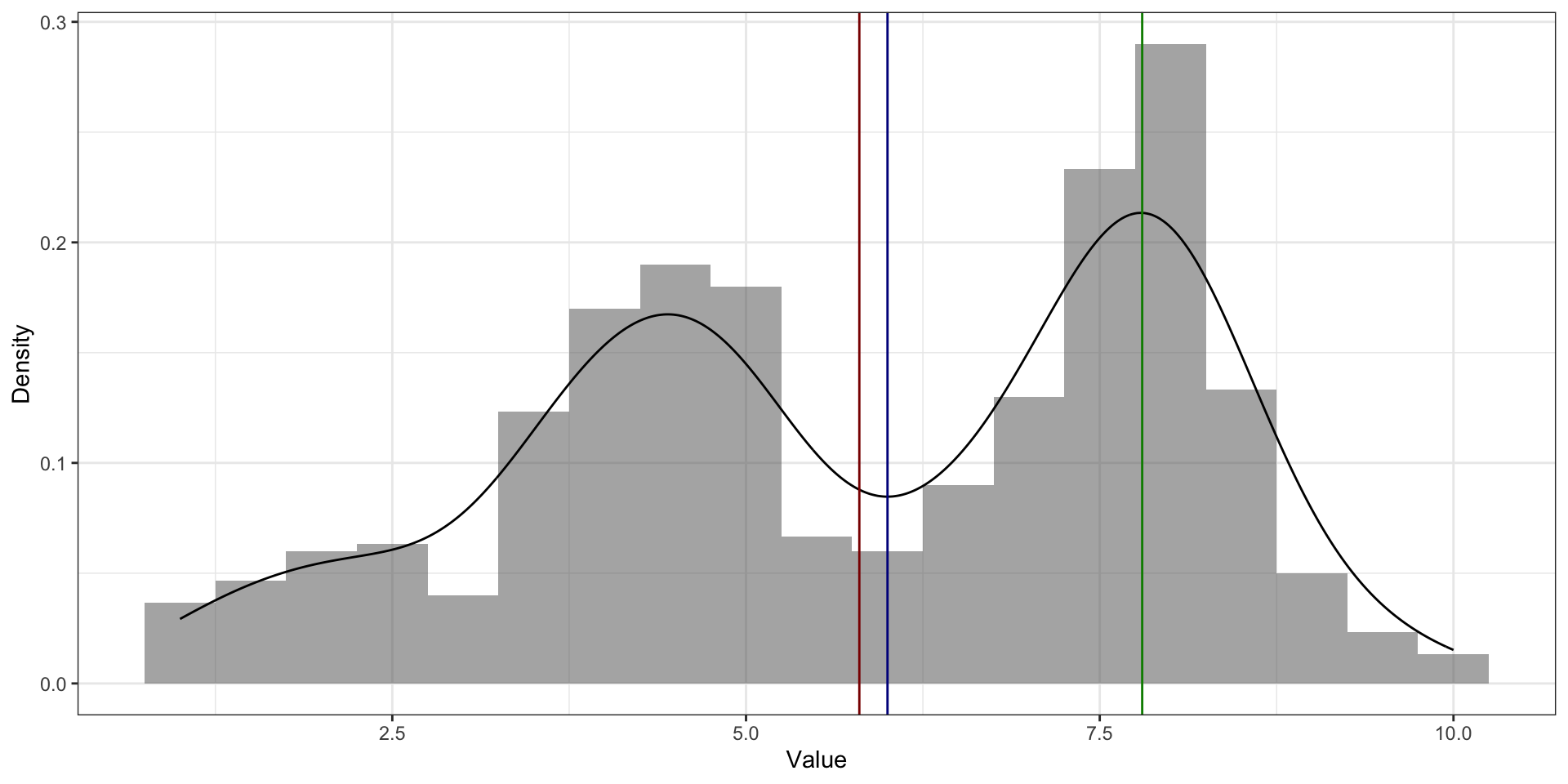 Мода [непрерывной переменной] — это значение переменной, при котором её функция плотности вероятности достигает локального[^local-max-mode] максимума.