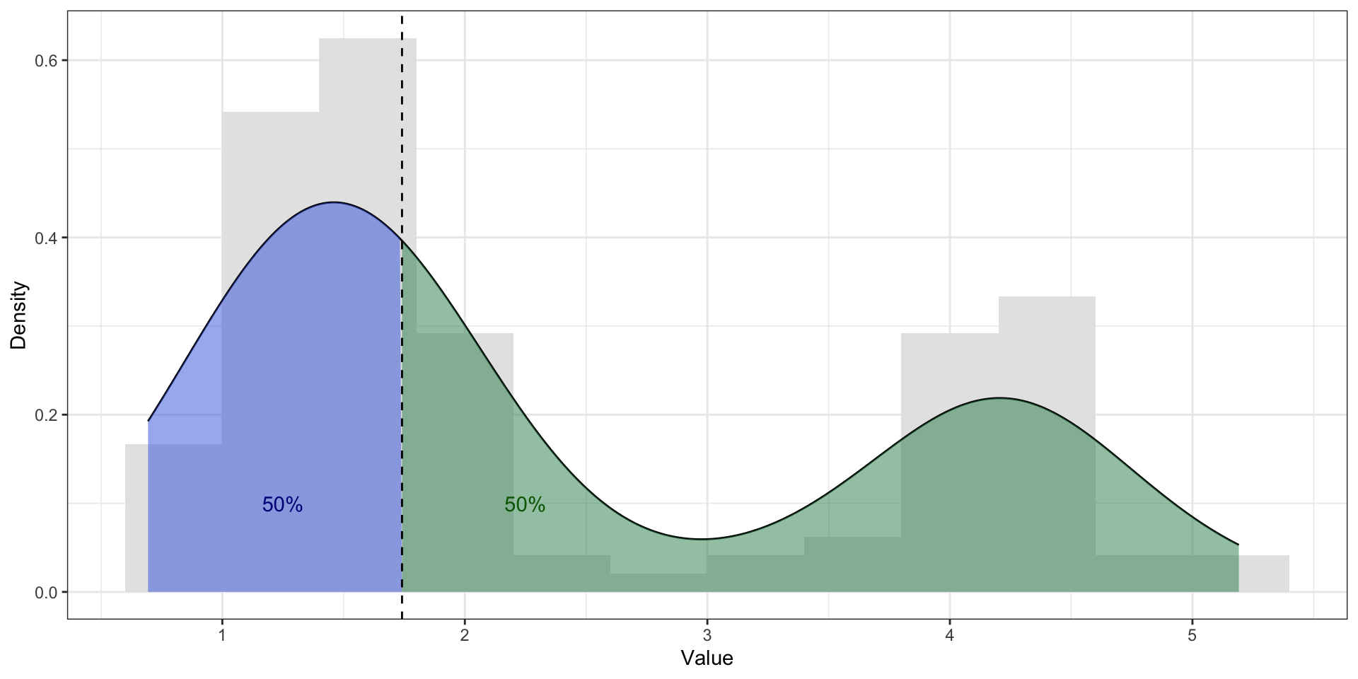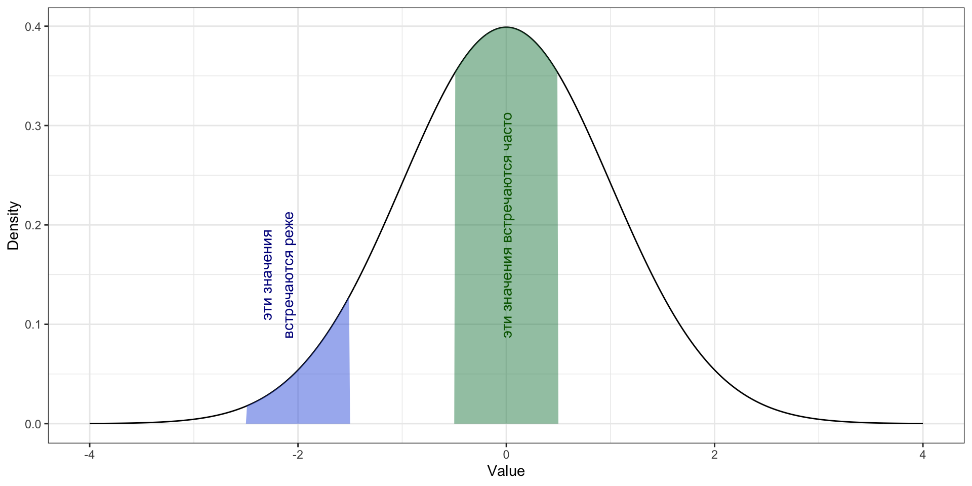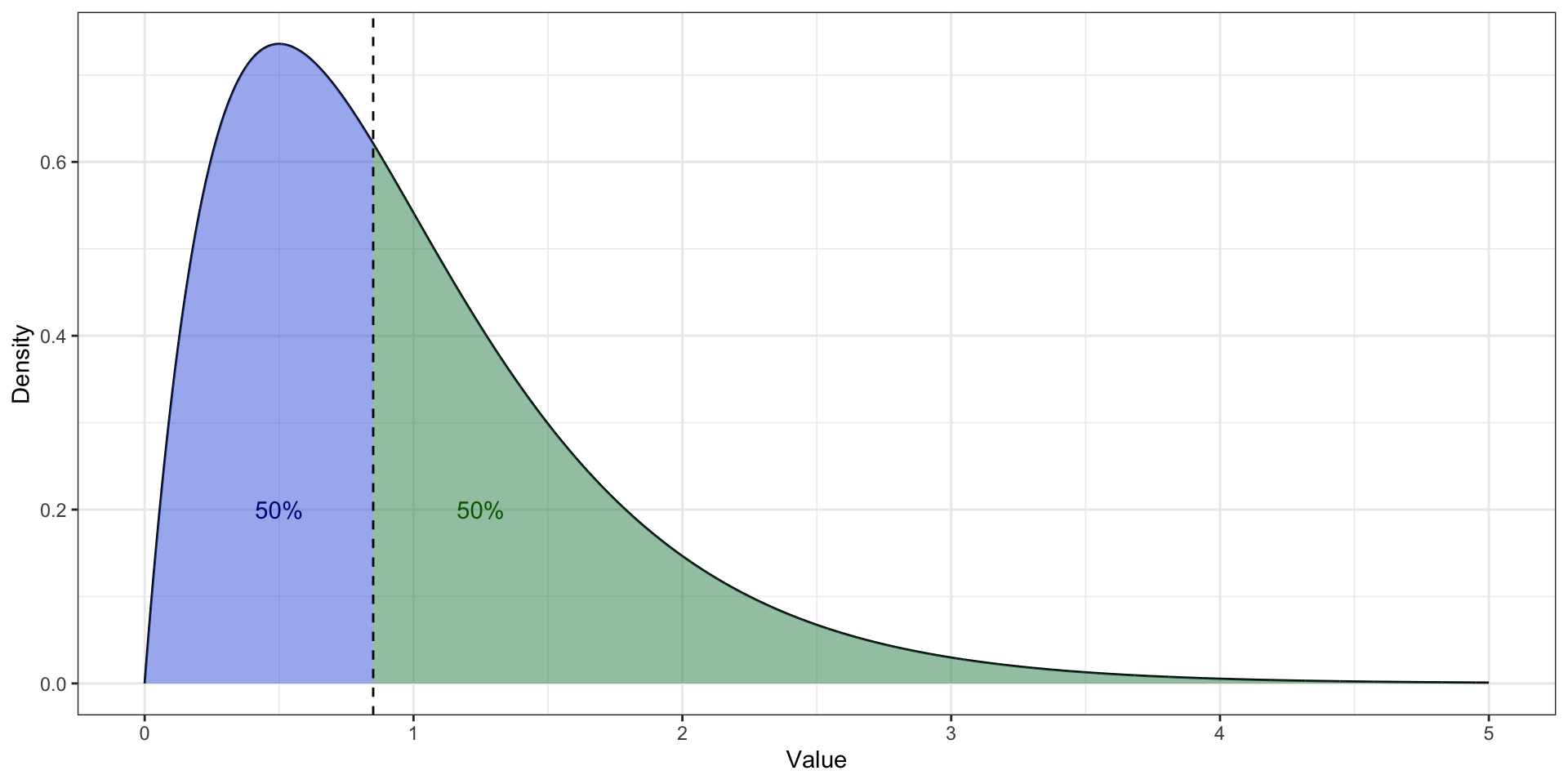 Квантиль — это значение переменной, которое не превышается с определенной вероятностью (обозначим её \(p\)). Иначе говоря, слева от значения квантиля лежит \(p\%\) наблюдений.