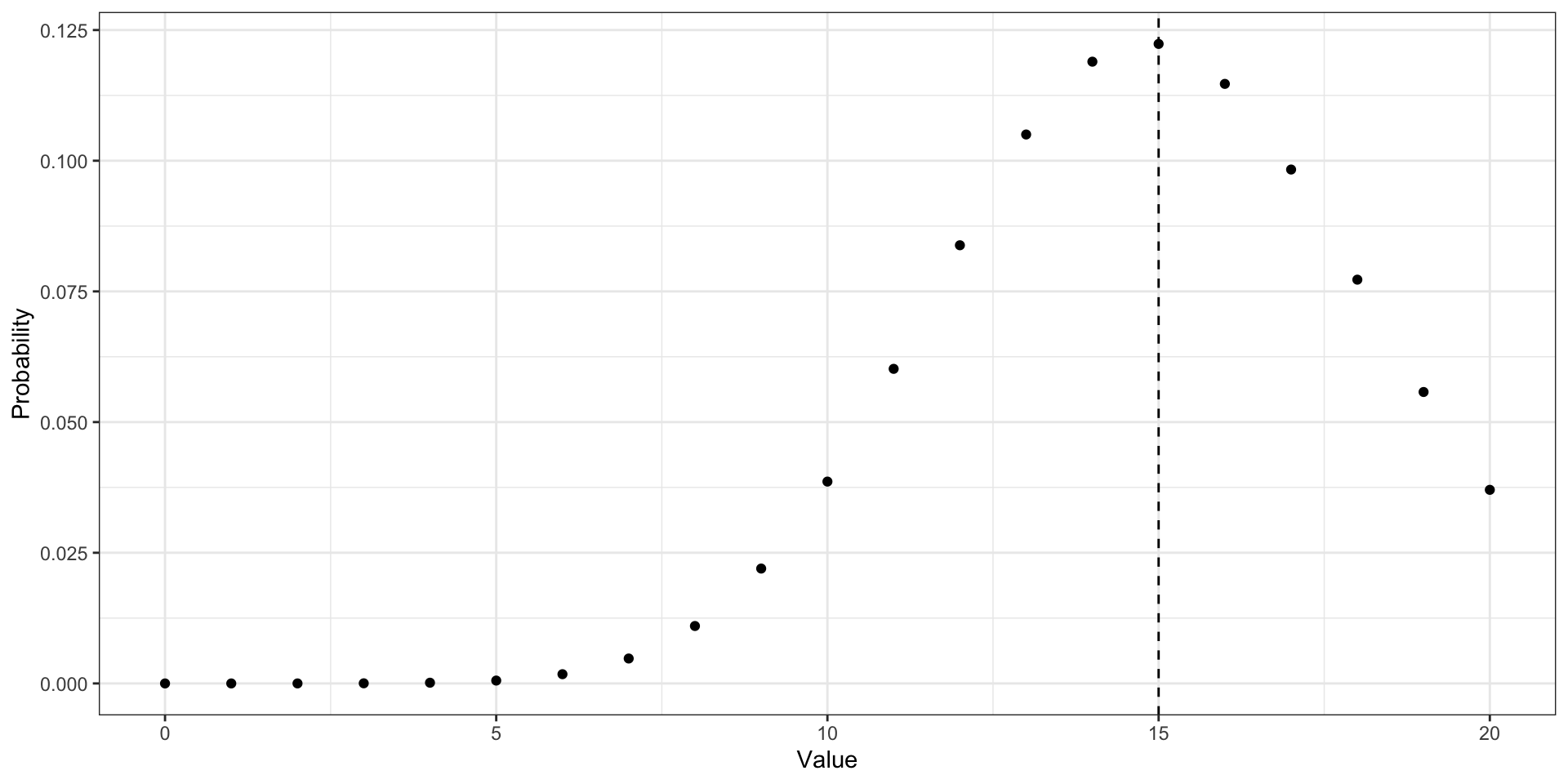 \[ \text{mode}(X) = \arg \max(\text{PMF}(X)) = \arg \max_{x_i}(\mathbb{P}(X = x_i)), \]