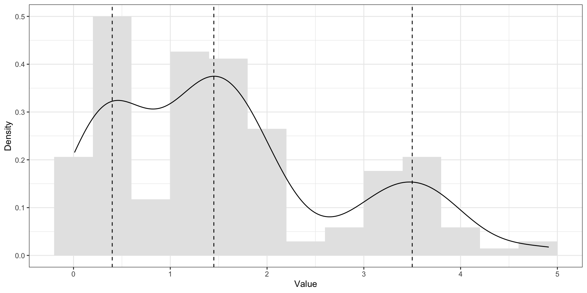 К слову, делить выборку можно не только на четверти — можно поделить, скажем, на 10 частей и получить децили. Так, слева от первого дециля (\(x_{0.10}\)) лежит 10% наблюдений, а слева от третьего (\(x_{0.30}\)) — 30%.