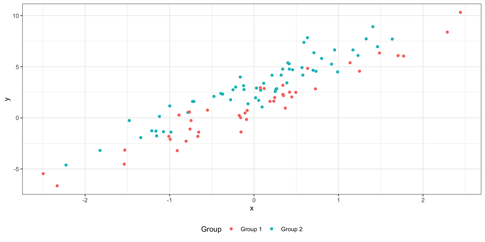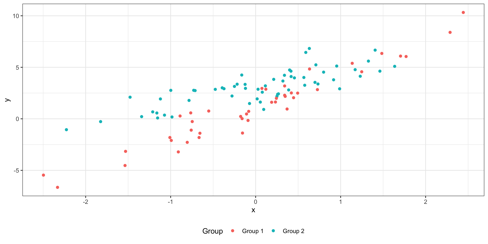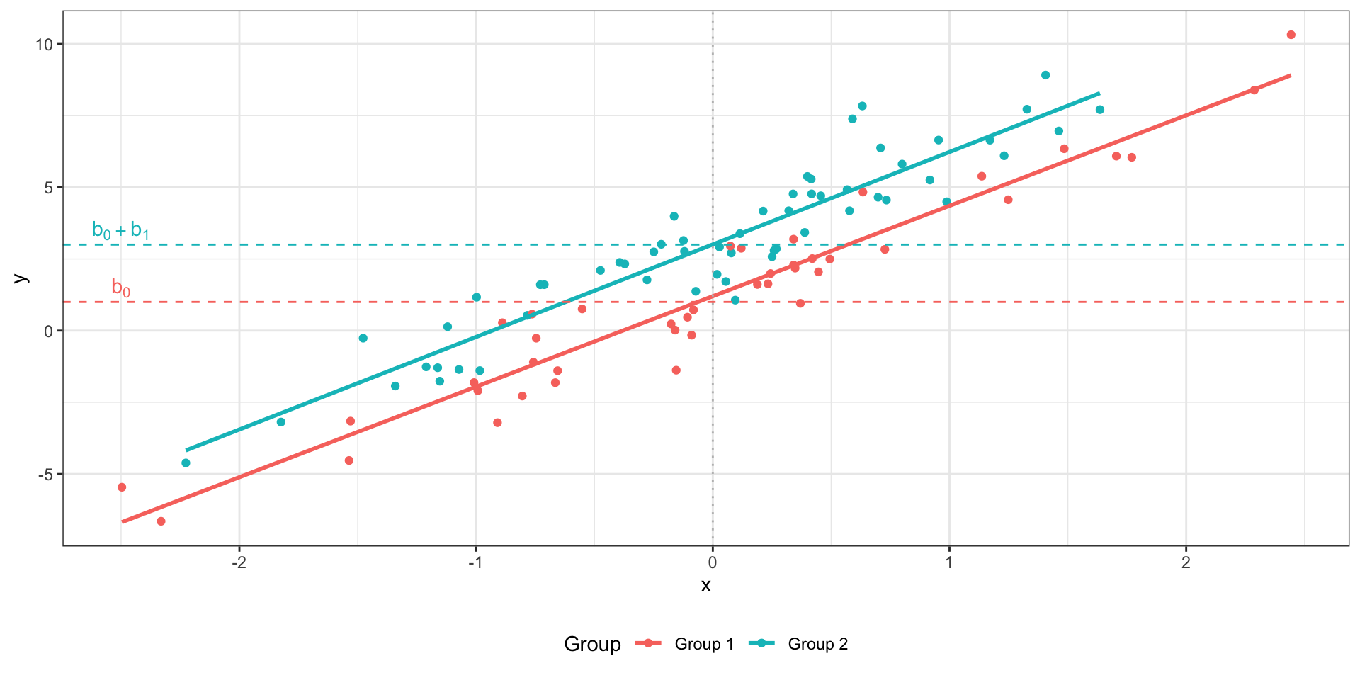 Group 1 (\(I_{i1} = 0\)): \(\hat y_i = b_0 + b_2 x_{i2}\)Group 2 (\(I_{i1} = 1\)): \(\hat y_i = (b_0 + b_1) + b_2 x_{i2}\)