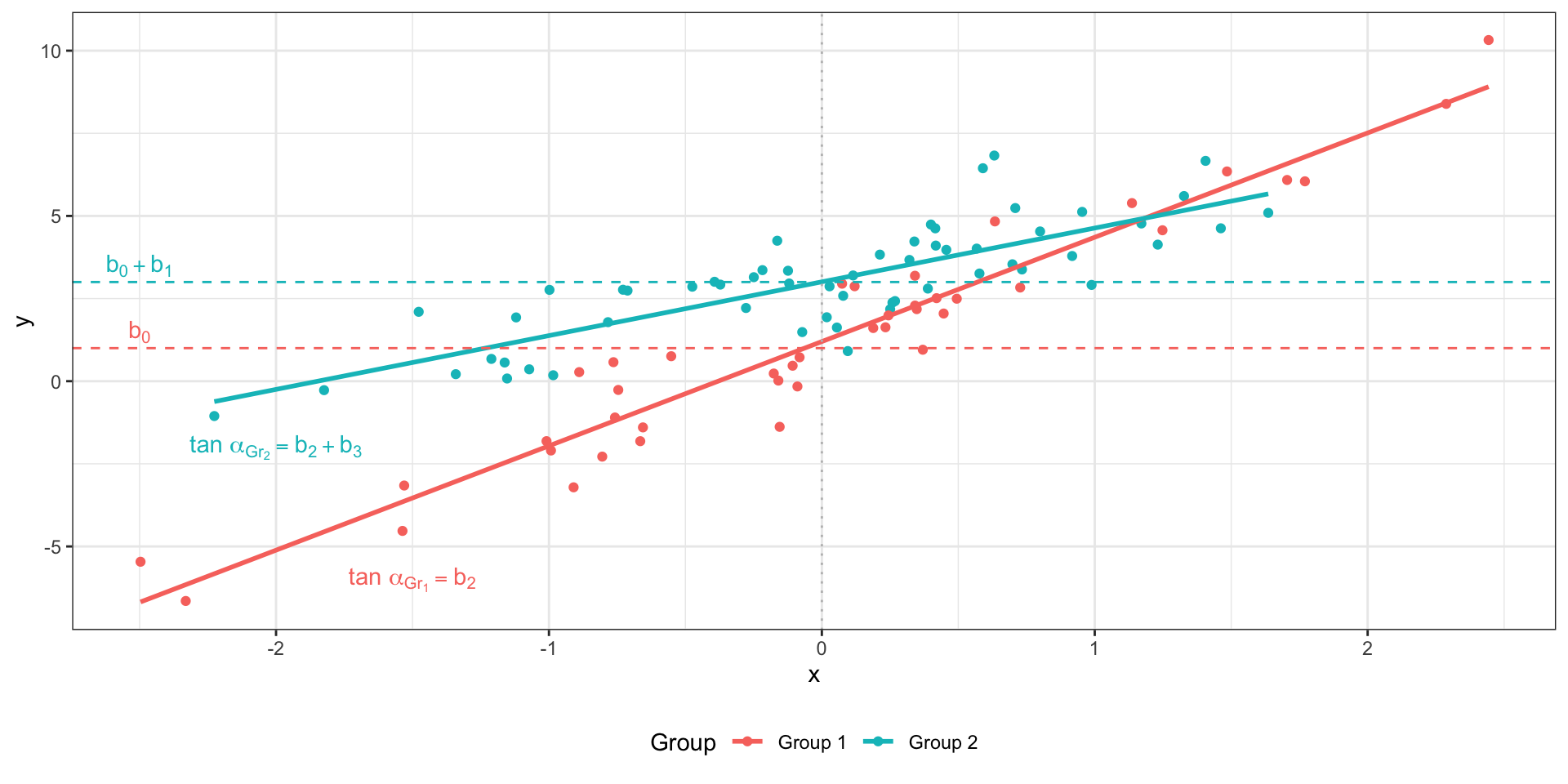 Group 1 (\(I_{i1} = 0\)): \(\hat y_i = b_0 + b_2 x_{i2}\)Group 2 (\(I_{i1} = 1\)): \(\hat y_i = (b_0 + b_1) + (b_2 + b_3) x_{i2}\)