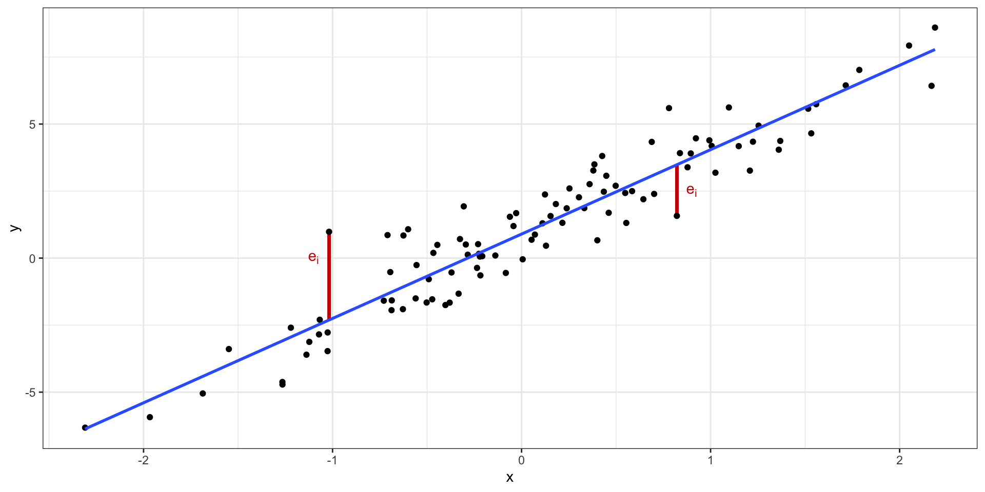 \(b_0 = \hat \beta_0\) и \(b_1 = \hat \beta_1\) — оценки параметров генеральной совокупности, \(e_i\) — ошибки (или остатки, residuals) модели.