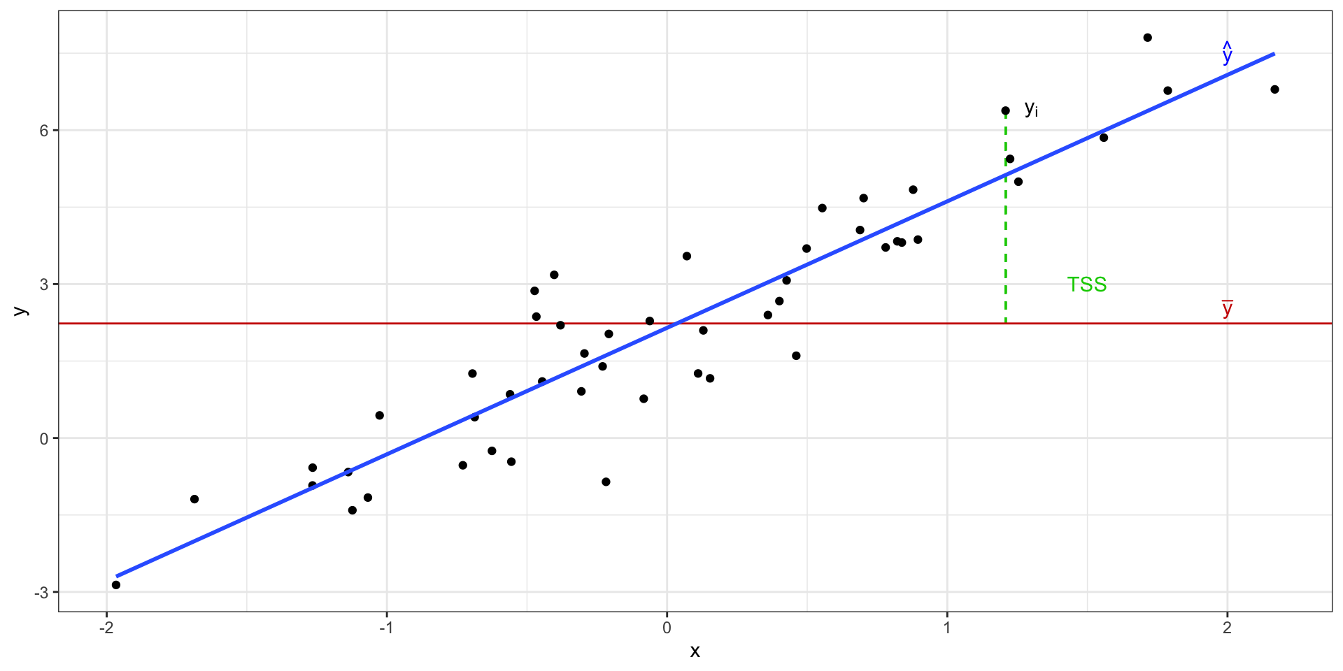 \[ \text{TSS} = \sum_{i=1}^n (\bar y - y_i)^2 \]