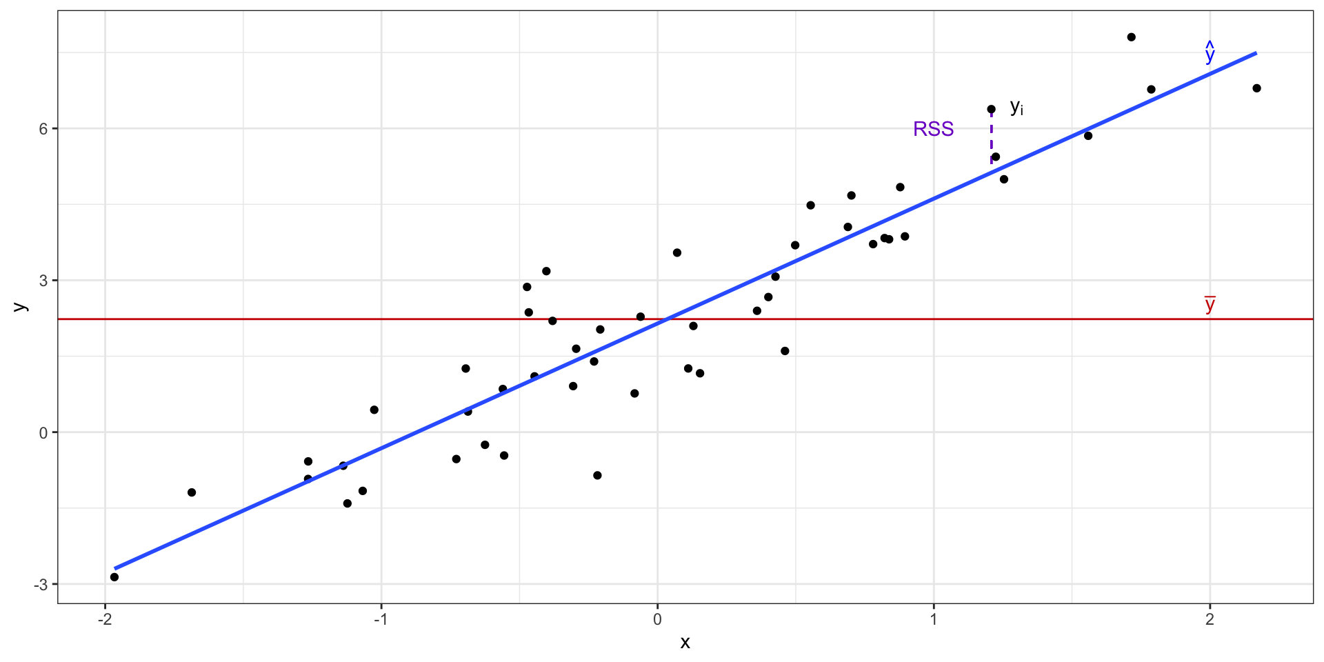 \[ \text{RSS} = \sum_{i=1}^n (y_i - \hat y_i)^2 \]