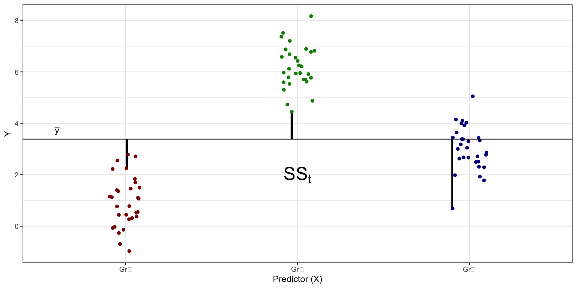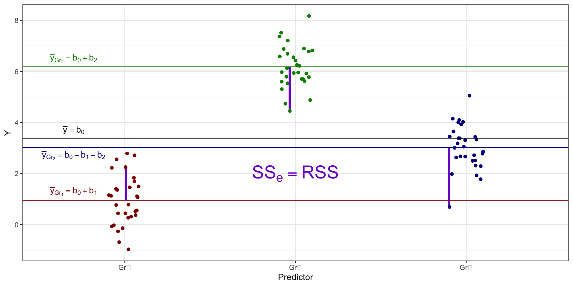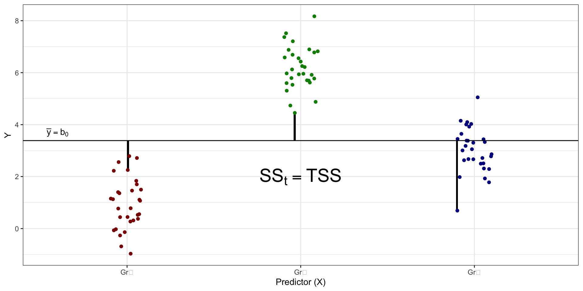 \[ \begin{split} \text{TSS} &= \text{SS}_t = \displaystyle \sum_{i=1}^n (\bar y - y_i)^2, \\ \text{ESS} &= \text{SS}_X = \displaystyle \sum_{j=1}^k n_j \cdot (\bar y - \bar y_j)^2, \\ \text{RSS} &= \text{SS}_e = \displaystyle \sum_{j=1}^k \sum_{i=1}^{n_j} (\bar y_j - \bar y_{ji})^2, \end{split} \]