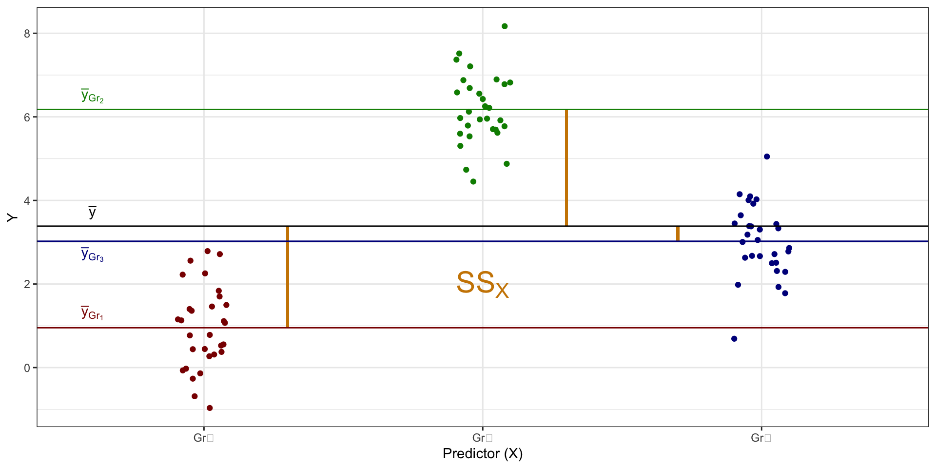 факторная изменчивость, или объясненная сумма квадратов (explained sum of squares, \(\text{SS}_X\))